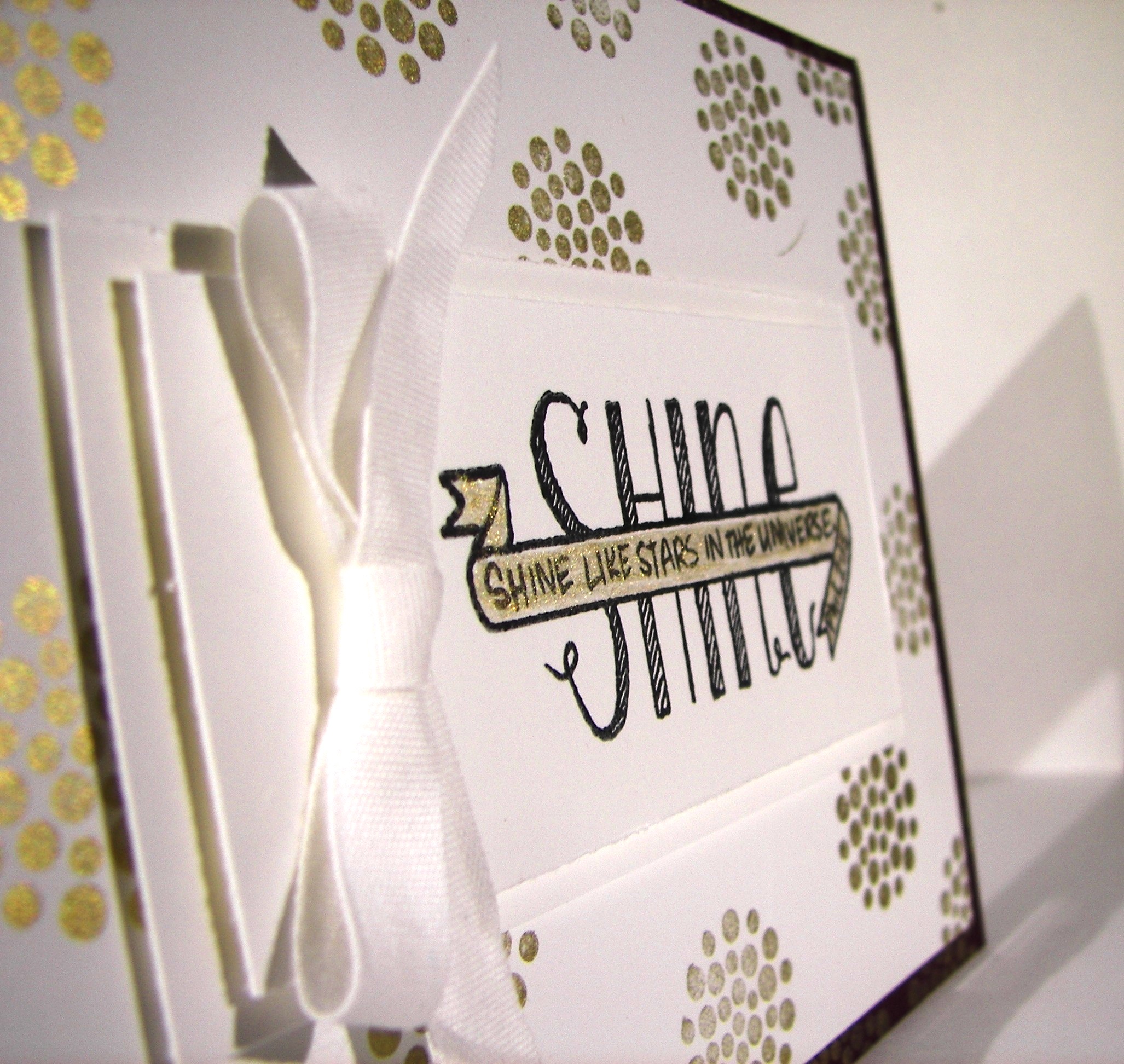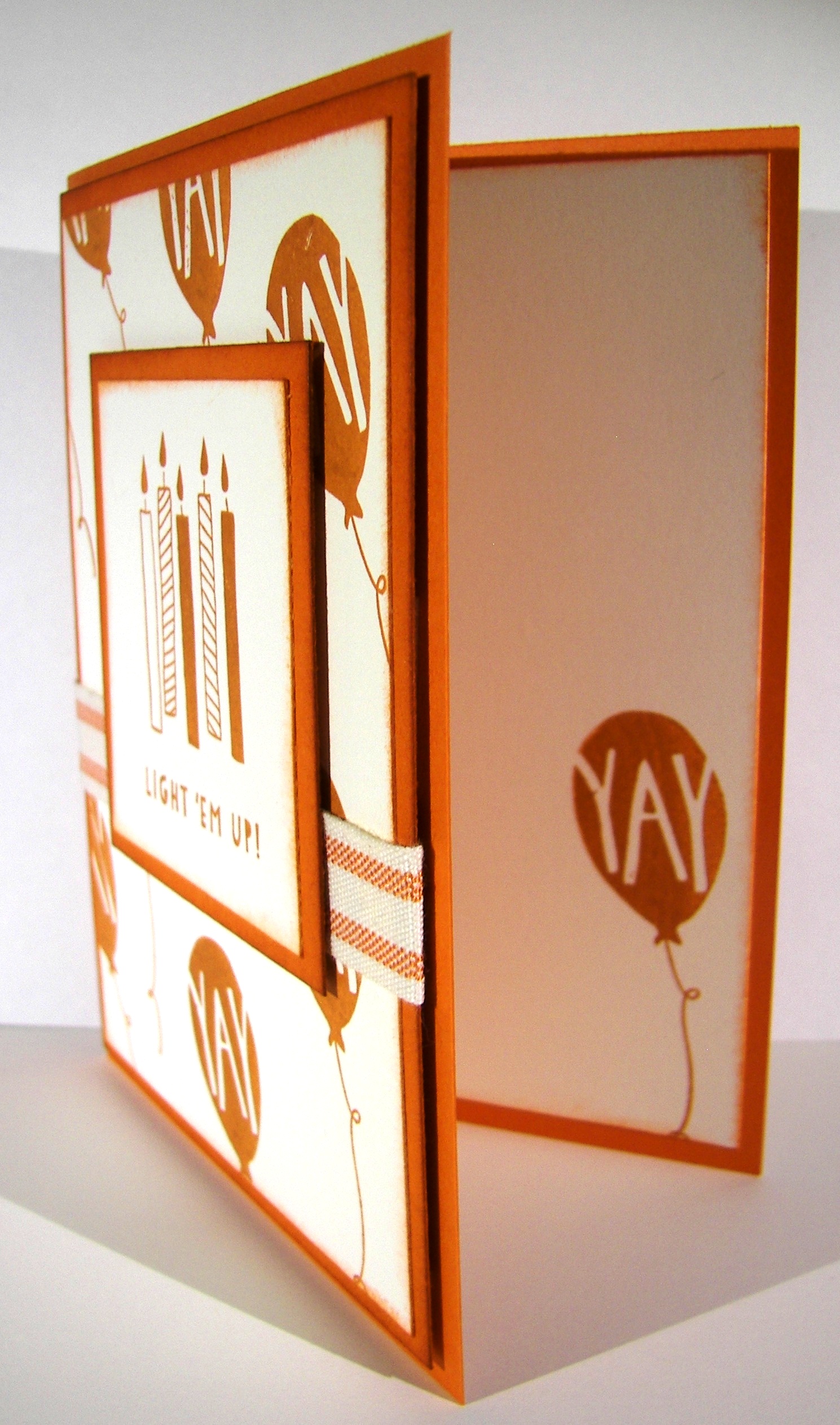 The solid bakers twine really makes me happy. I had longer strings attached to each balloon and trimmed them after they were squished into place with glue dots. With the extra hanging off the card I tied one simple knot and used it as the embellishment for the gift card sized gift bag. I do hate wasting product. It turned out great!