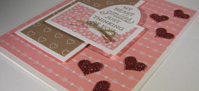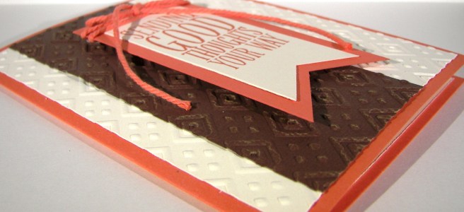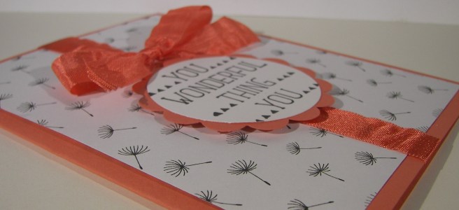 The sentiment was stamped on whisper white and layered with a scalloped circle of calypso coral to coordinate with the card base. Don’t you just love this paper? Full of whimsy and cuteness. The simplicity of the color scheme also keeps this one very clean and simple.