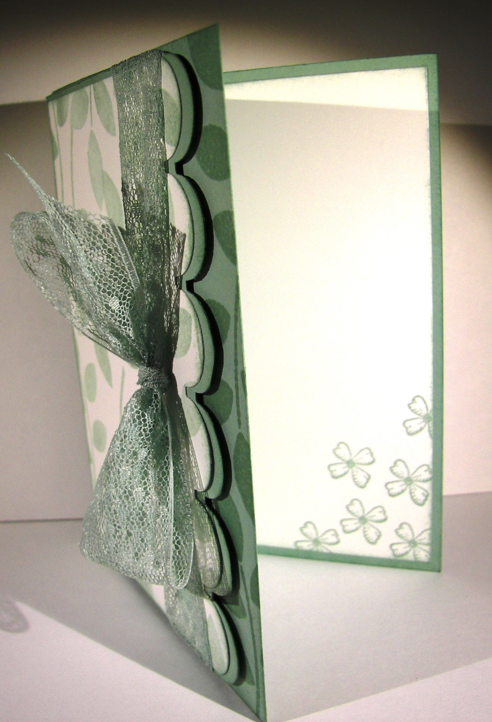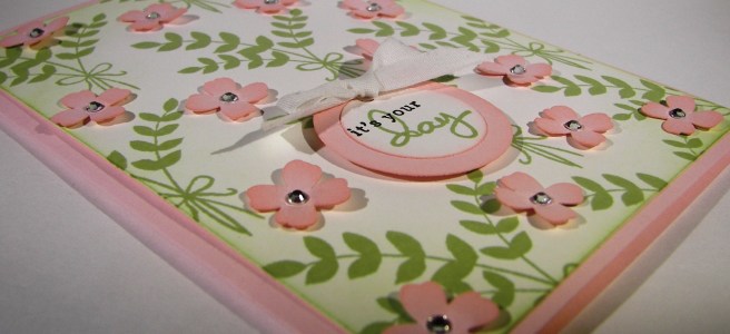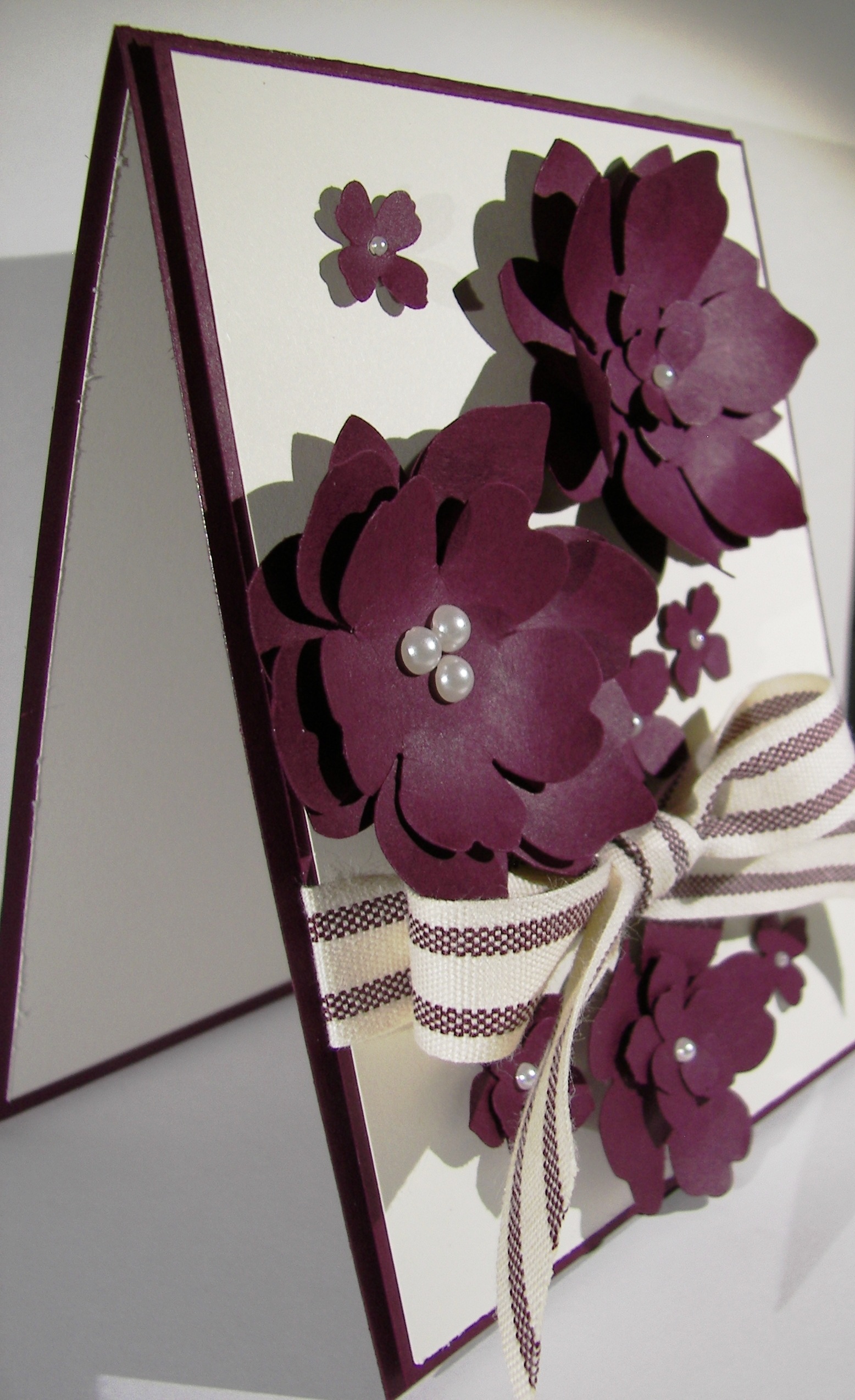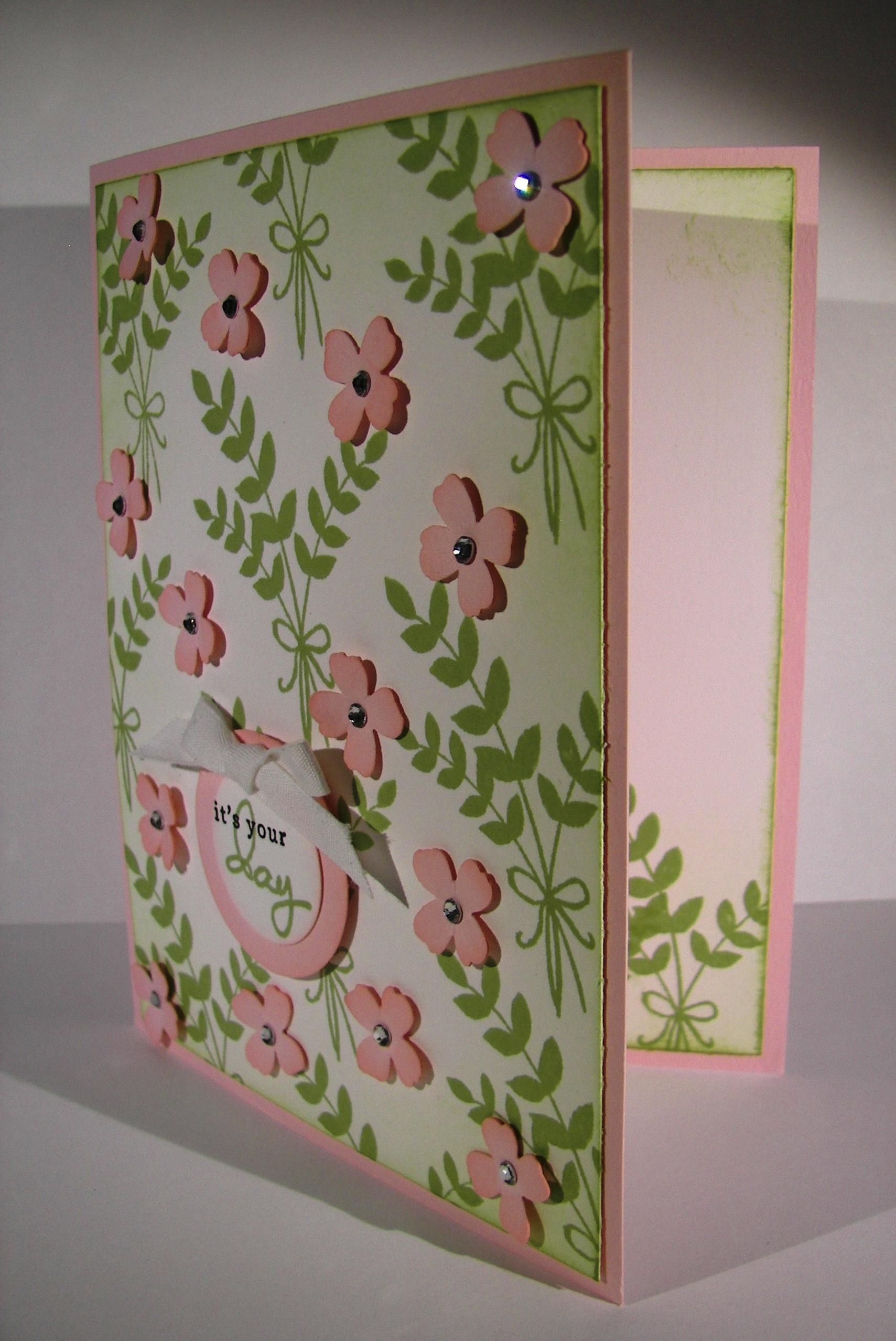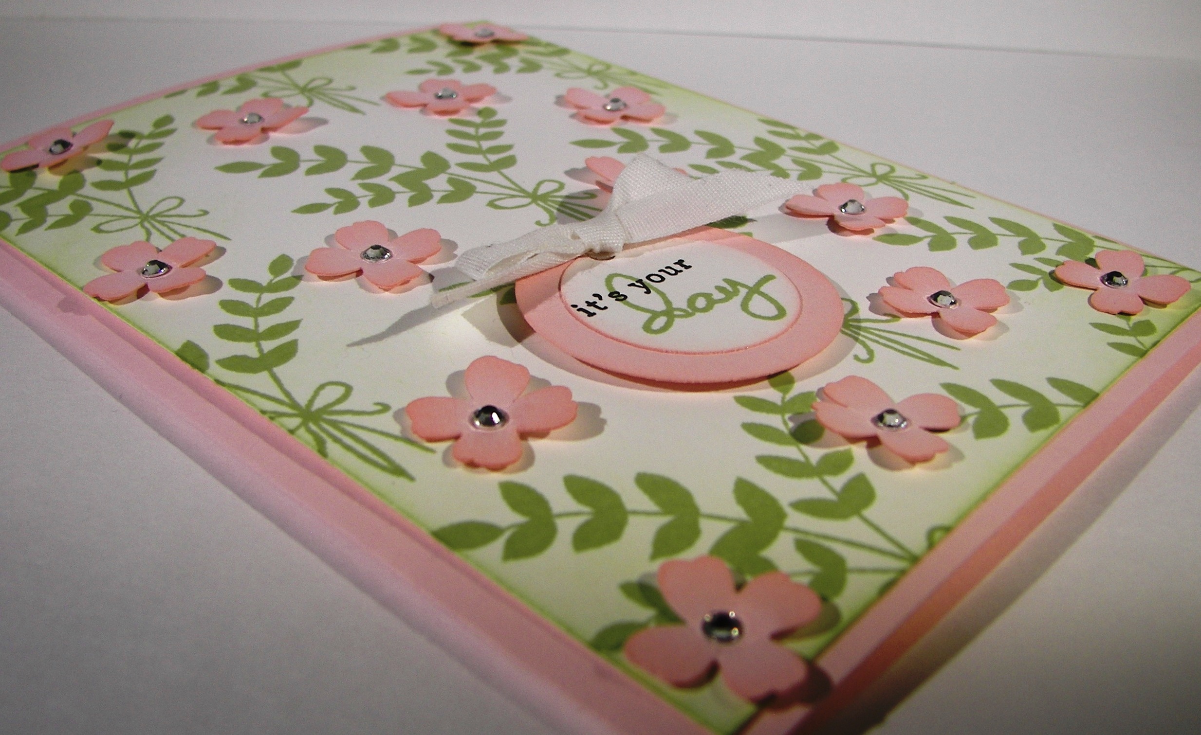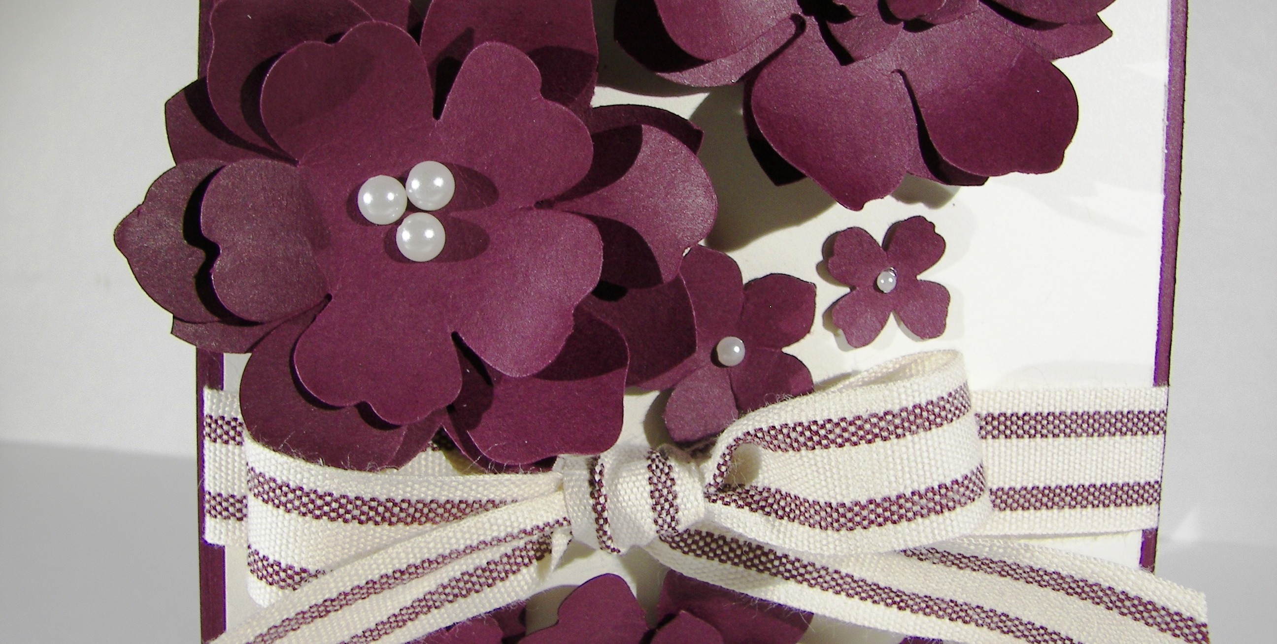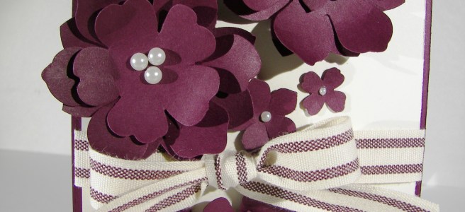 There isn’t even any ink here at all. No sponging or a sentiment either. Very clean and simple, with a ton of flowers, my favorite. Kind of like my comfort craft. All this card is about is punches, punches and more punches. Five different flowers all layered about with basic pearls to finish them off. I used the striped cotton ribbon because I wanted it to physically stand out as much as the flowers would. Bows and flowers and now I feel better.