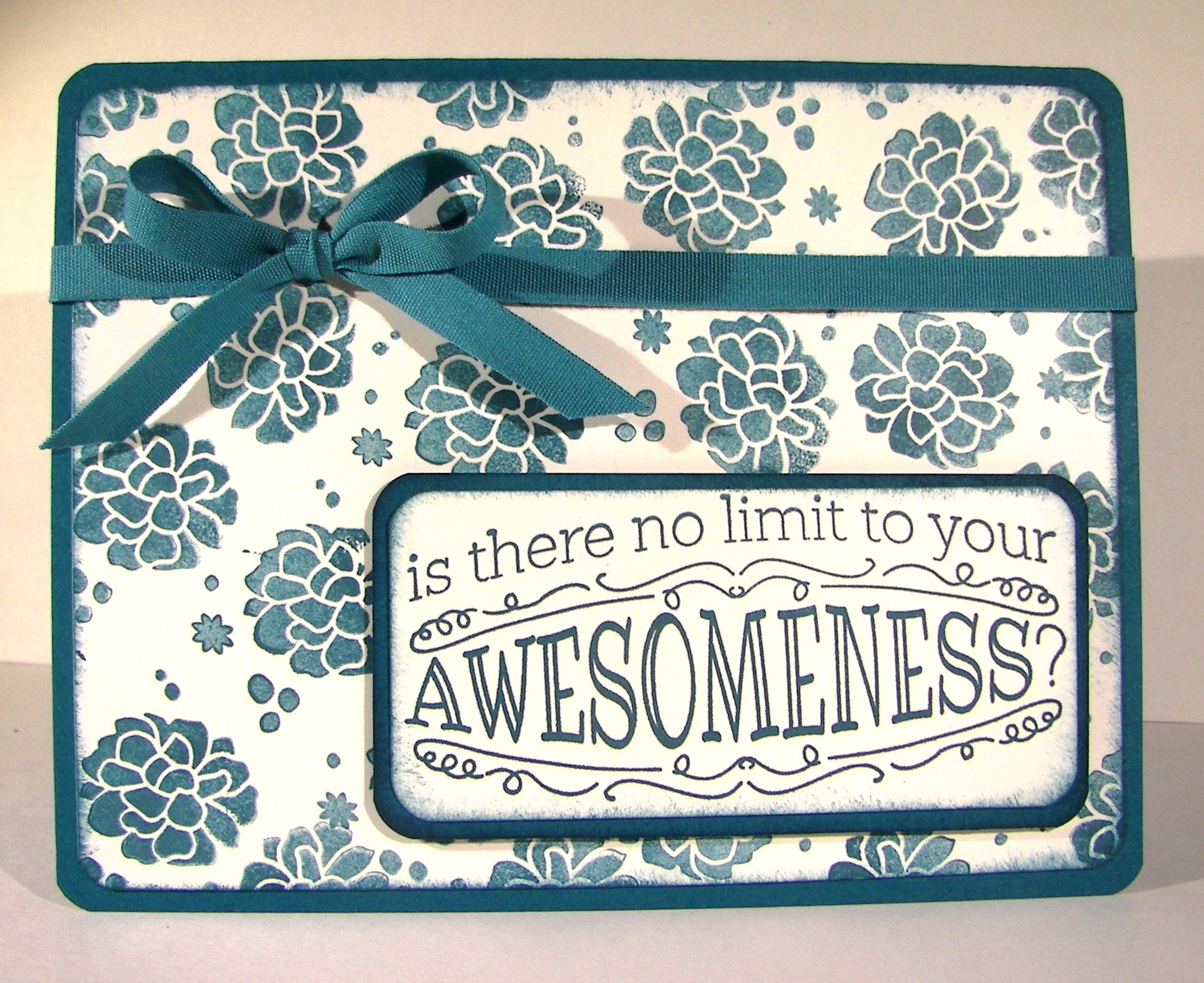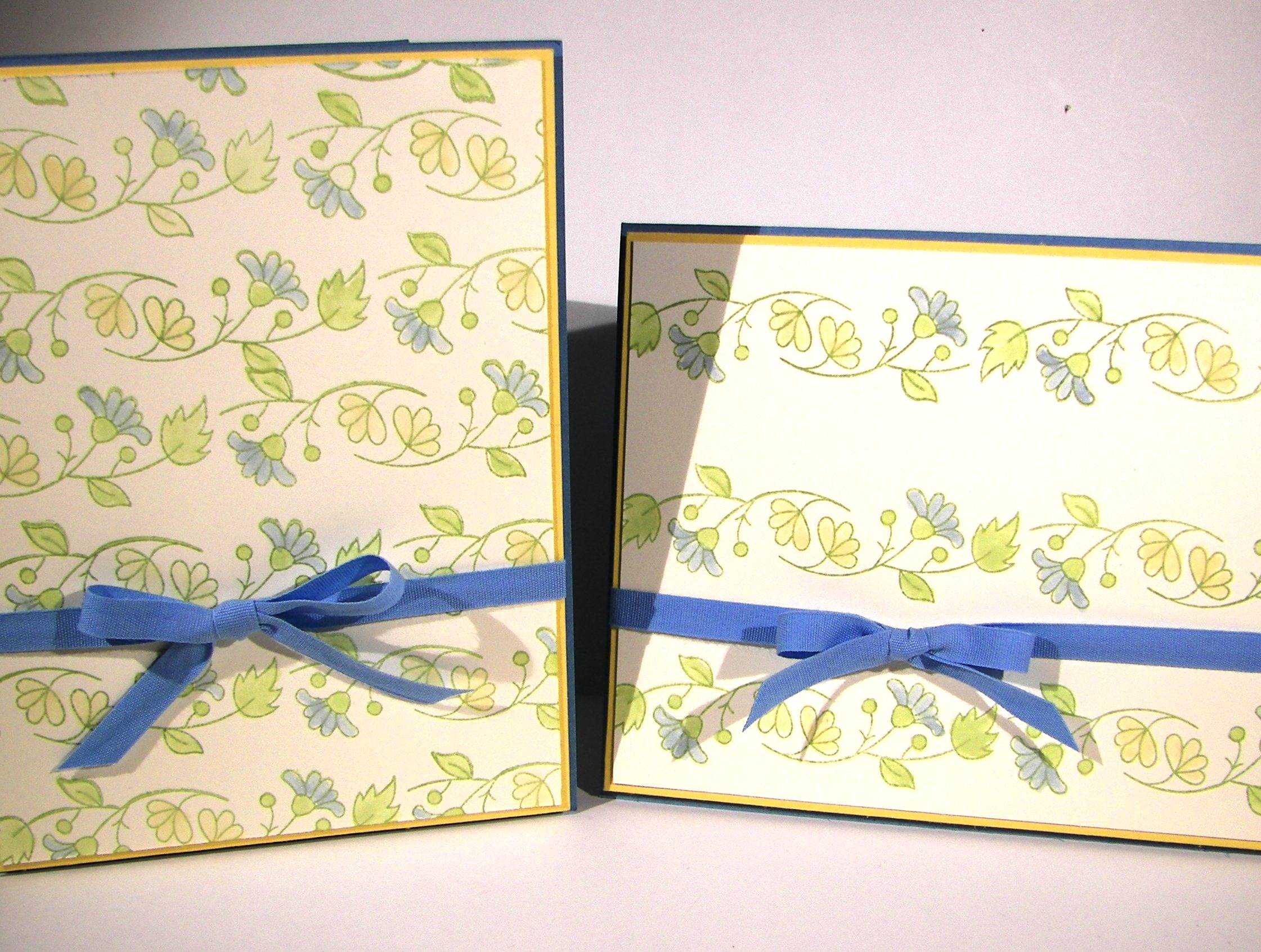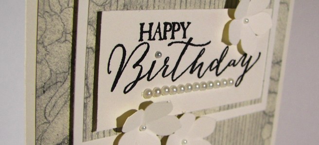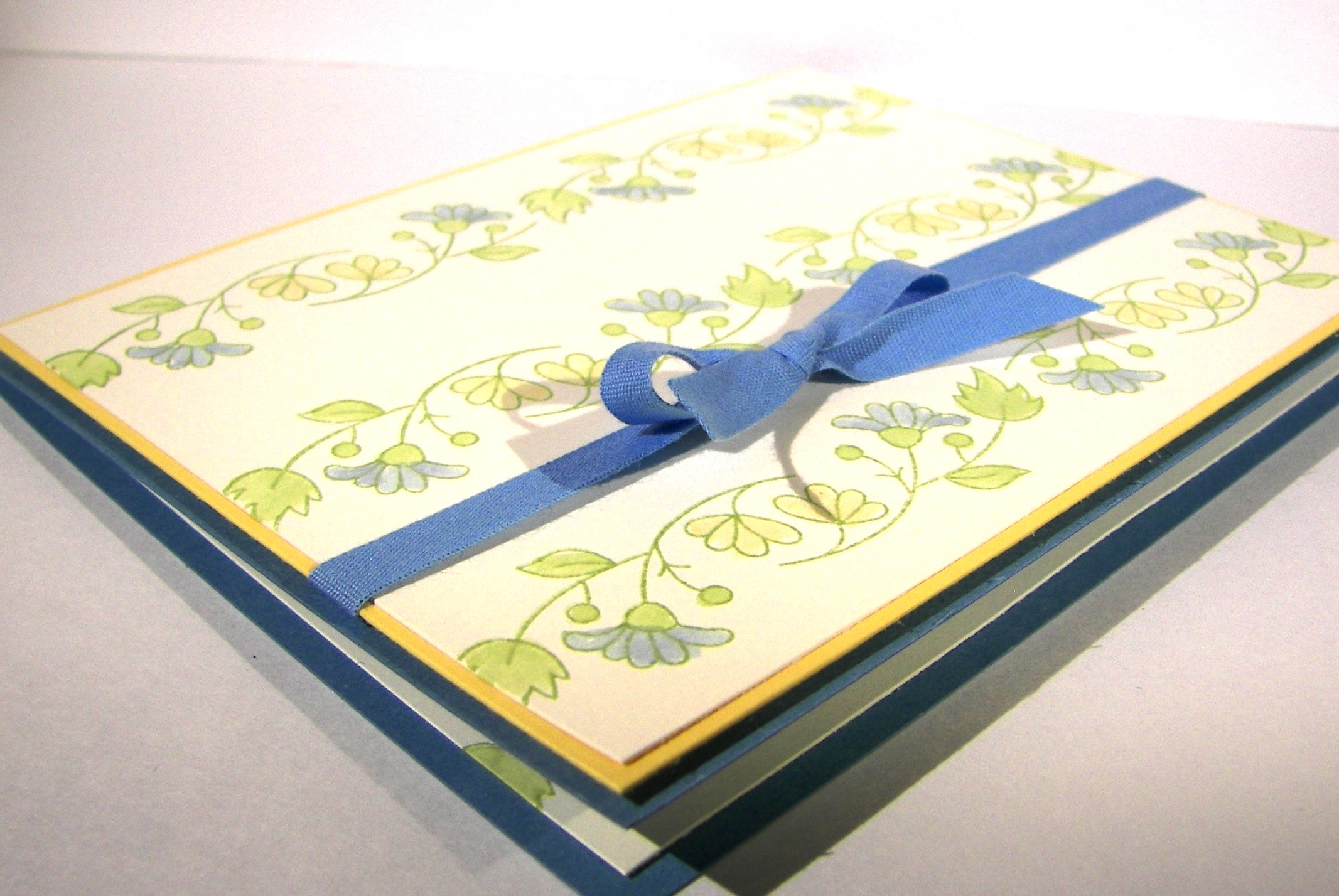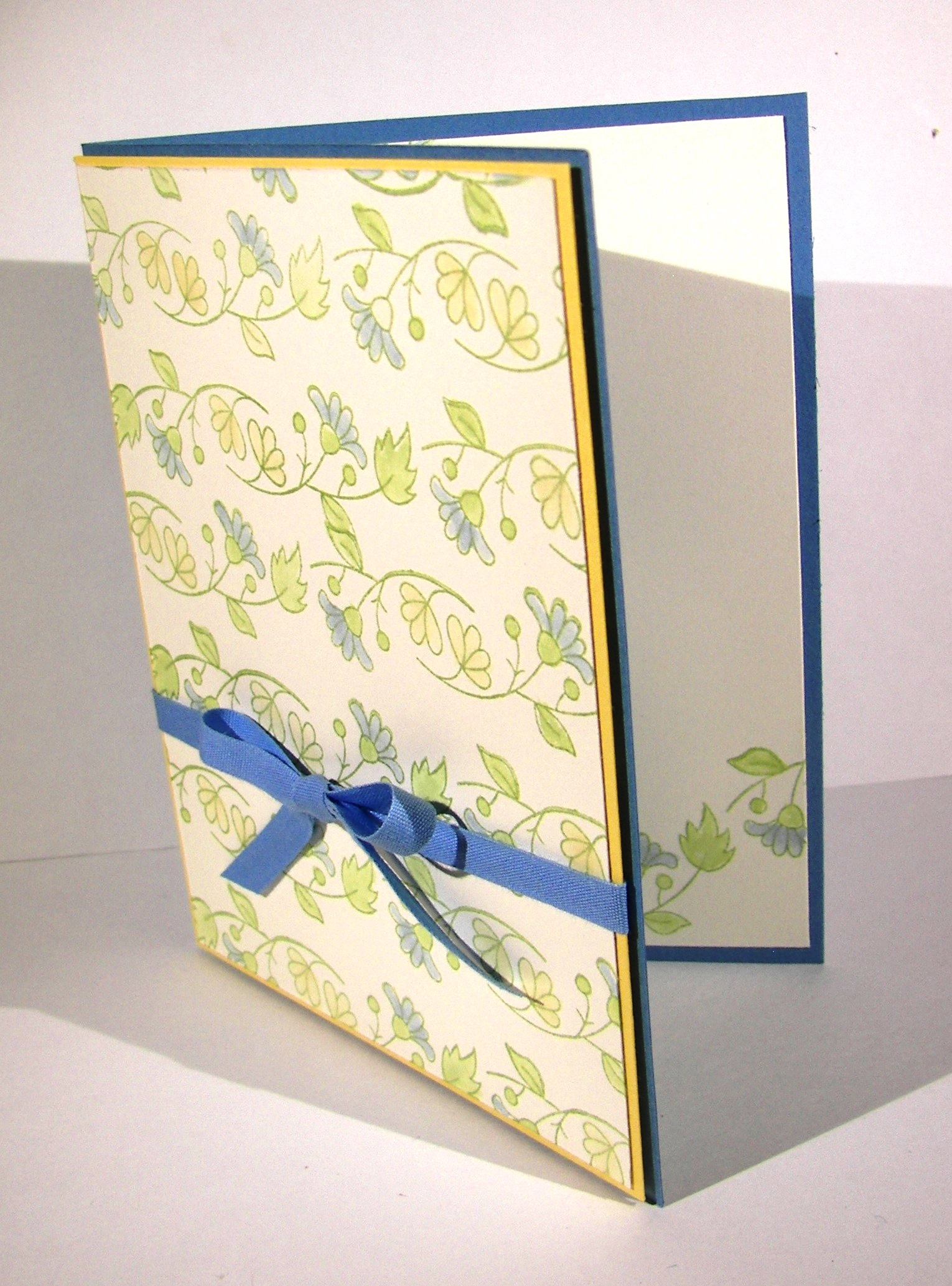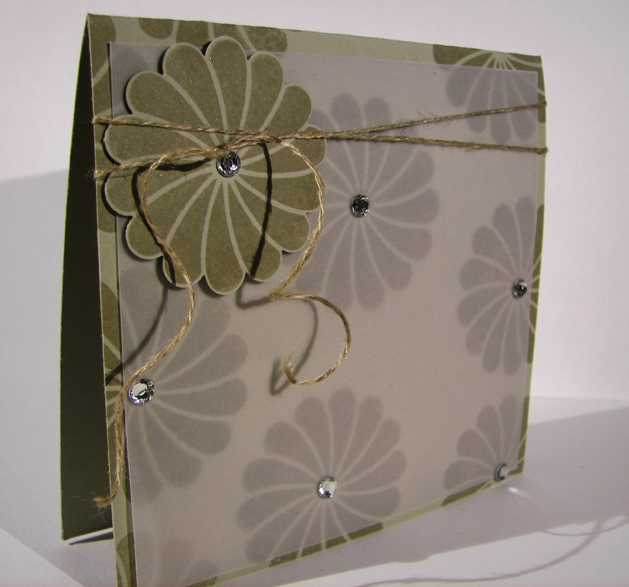 There isn’t even any ink here at all. No sponging or a sentiment either. Very clean and simple, with a ton of flowers, my favorite. Kind of like my comfort craft. All this card is about is punches, punches and more punches. Five different flowers all layered about with basic pearls to finish them off. I used the striped cotton ribbon because I wanted it to physically stand out as much as the flowers would. Bows and flowers and now I feel better.