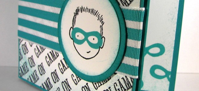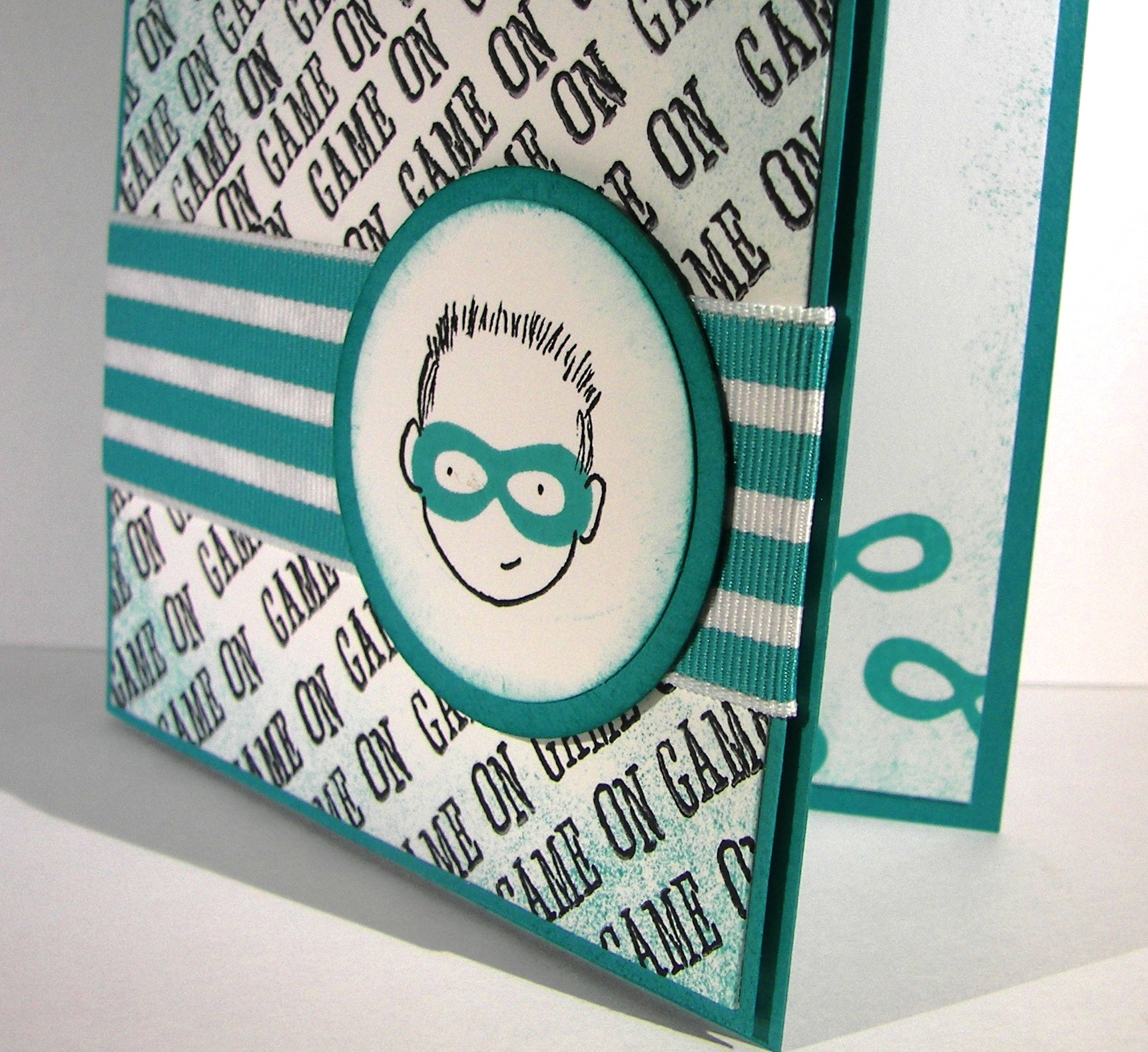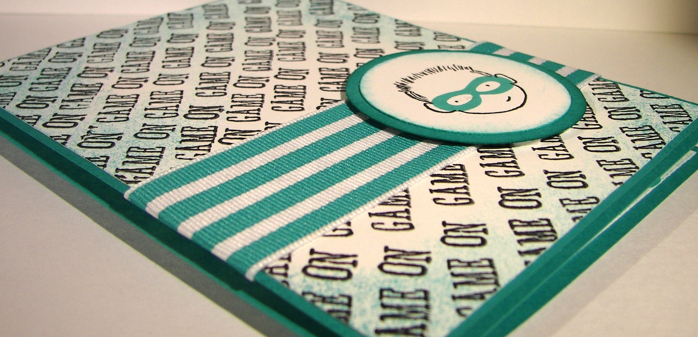 Instead of a bow like the last card, I wrapped it twice around and gave it a little know. It looks great! To keep with the sponged look of the wood background I sponged the card front equally well. That also helped to draw additional focus to that awesome chicken, as if he needed help.