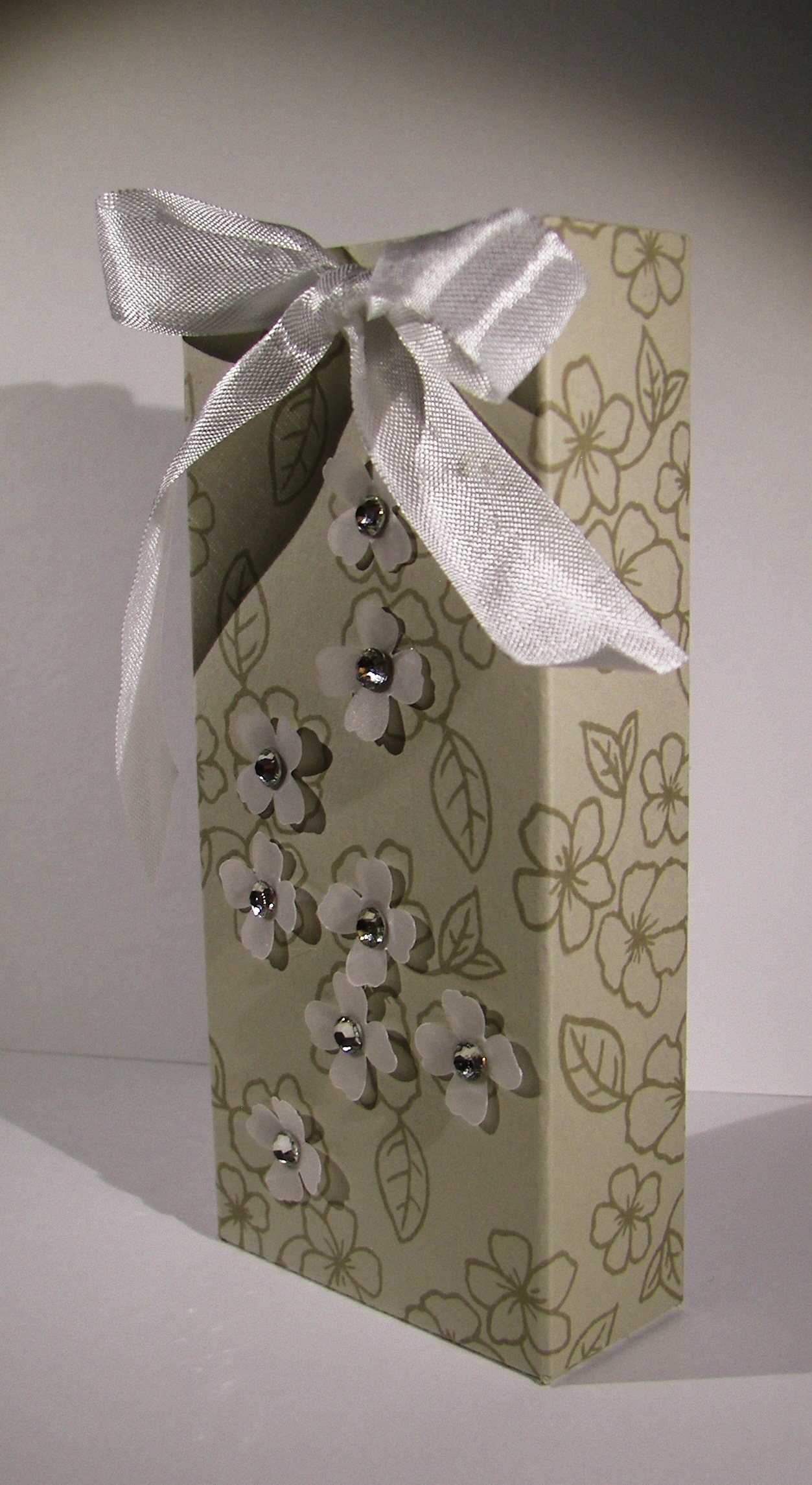And what set of mine would be complete without an adorable matching bag? It was made from a card base that was cut at 4 1/4 x 11″. Simple scoring, stamping tone on tone with a smaller flower image from the same set, and adorned with velum flowers and rhinestones. As you can tell, I stamped my sentiment on velum as well.