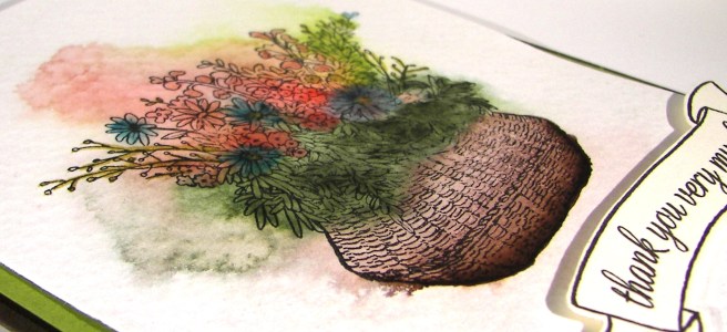 This project didn’t take too long to create in its basic form, but I did spend a good amount of time water coloring it. The truck stamp was stamped with versafine ink on the recessed side of the embossing folder. Then the paper was placed and those pieces were run through the big shot machine. This gave me the embossed trees and the stamped truck. A brayer was inked up with crumb cake and gently rolled over the embossed trees. That is how they became colored so tidily.