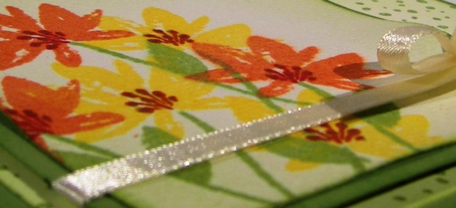 The background, and a bit on the inside, was stamped with the spotted stamp from the same set. It is random, but has a defined shape to allow filling in the entire space without looking repetitive. Very nice, very nice indeed. The front piece was wrapped in some very vanilla satin ribbon and layered up on dimensionals. The sentiment was left off completely allowing this to be an all occasion card ready to go.