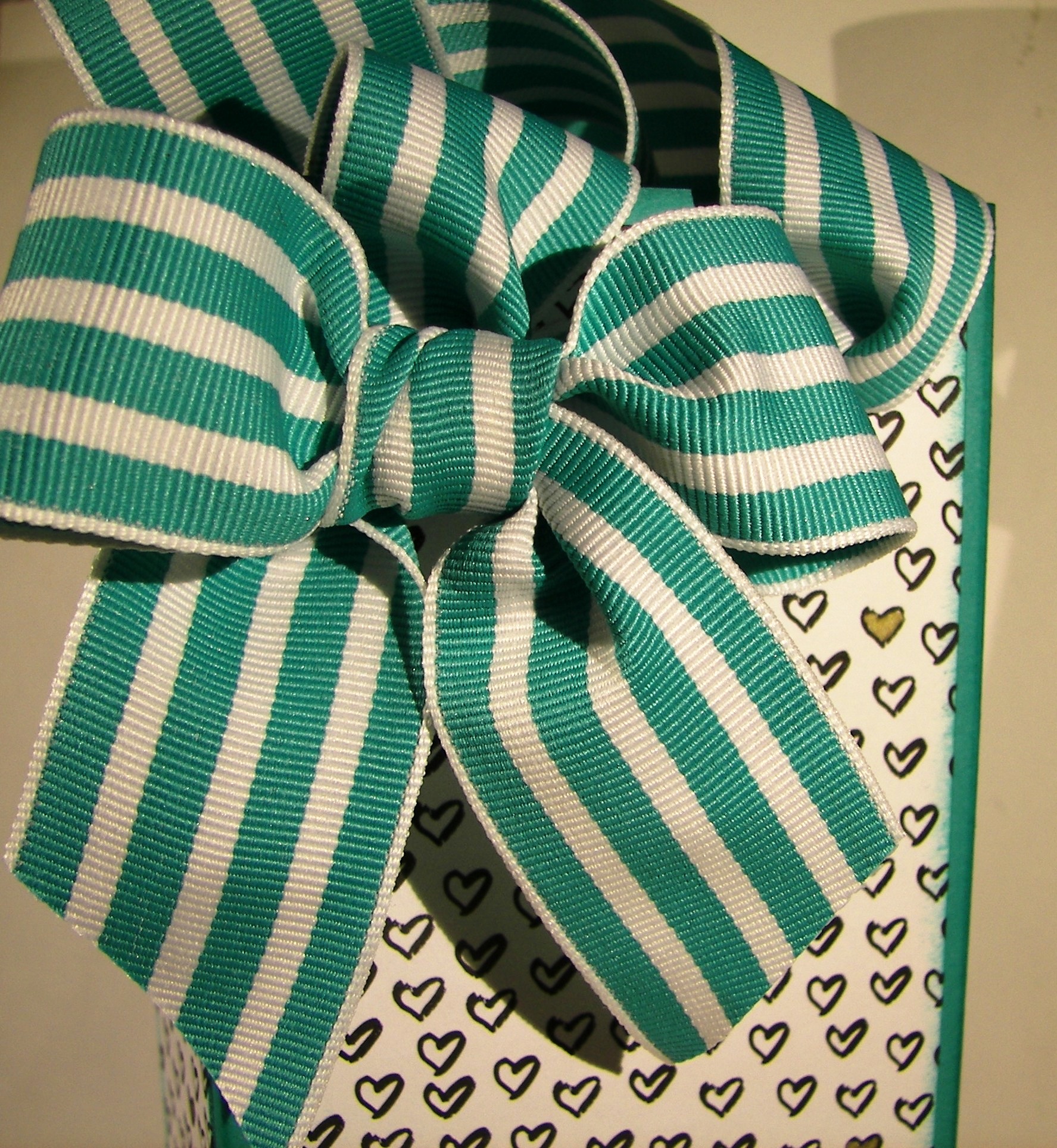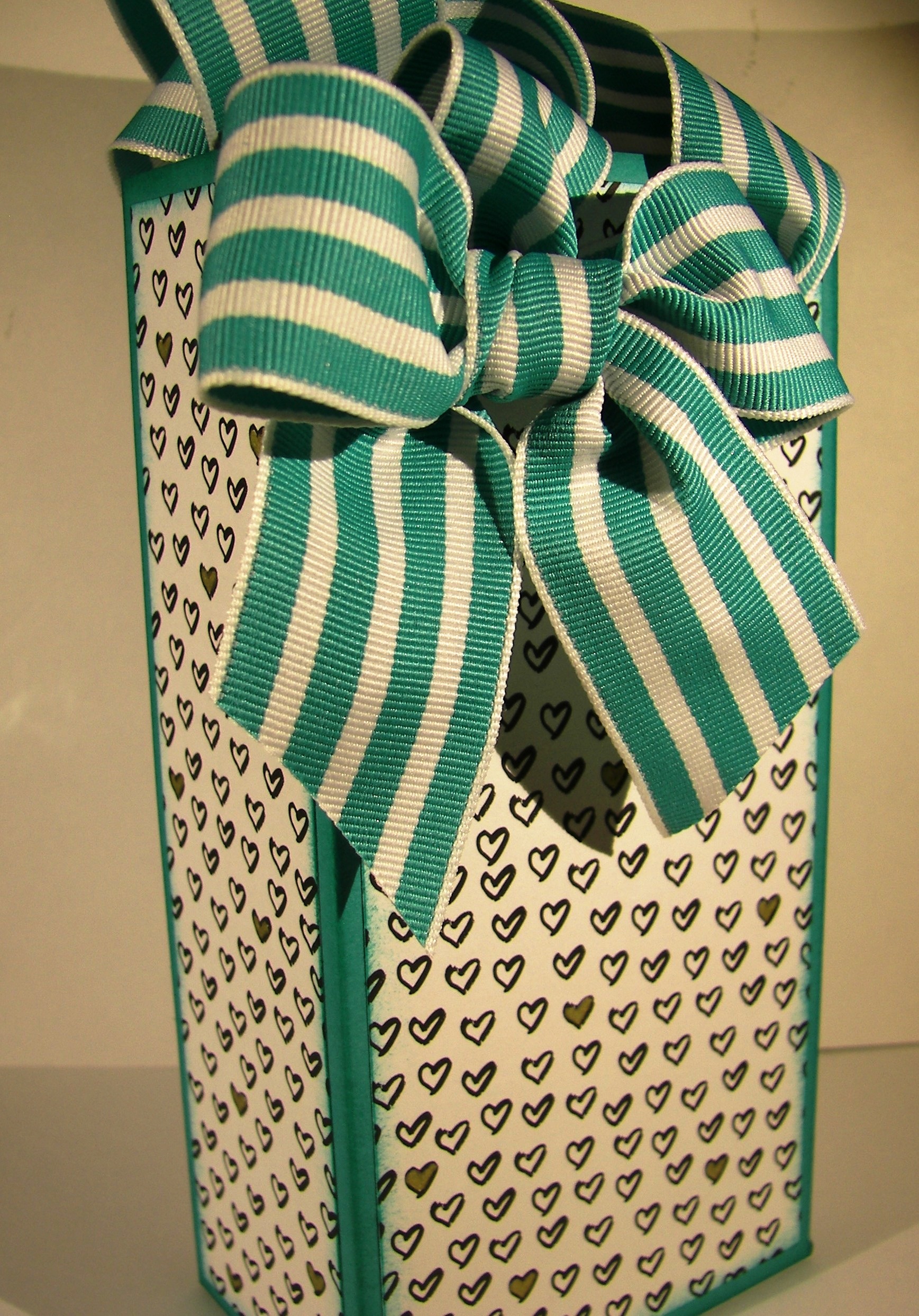 This ribbon is so wonderful.  I knew I wanted a huge bow out front, so I threaded it a bit differently.  I made sure to have the ends out front, both long enough to make this pretty bow.  I just tied the ribbon together with bakers twine right at the front of the box which left two long strands of ribbon hanging down just ready to go.  I did have to fuss the bow a bit to get it where I wanted it, and used a couple of glue dots to keep the bow pulled back a bit.  Now I am ready to fill it up and give it away.  So much fun!