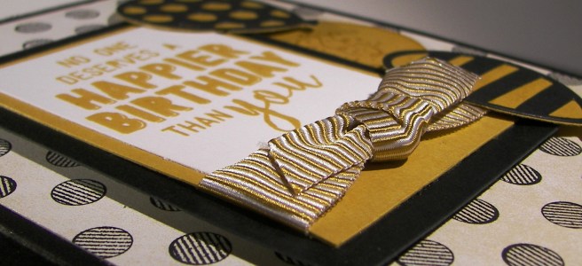 Instead of a bow like the last card, I wrapped it twice around and gave it a little know. It looks great! To keep with the sponged look of the wood background I sponged the card front equally well. That also helped to draw additional focus to that awesome chicken, as if he needed help.