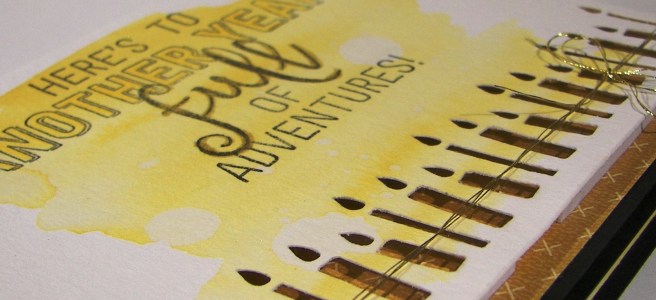 The background was stamped with the Hardwood stamp in smokey slate and sponged heavily. That is such a classic stamp. I am sure it will be around for a long time. The chicken was stamped in the upper center of the card front as to leave room for the ribbon and sentiment below. Water color pencils came in handy for a quick color job and touched up with an aqua pen to blend the colors in.