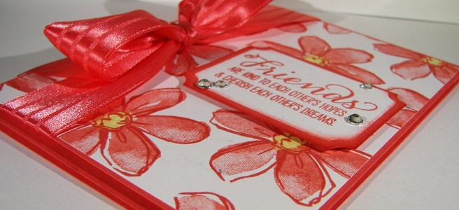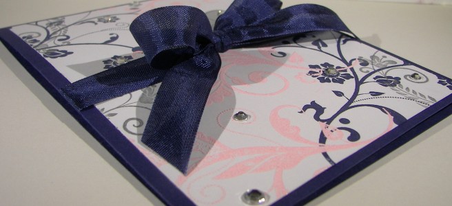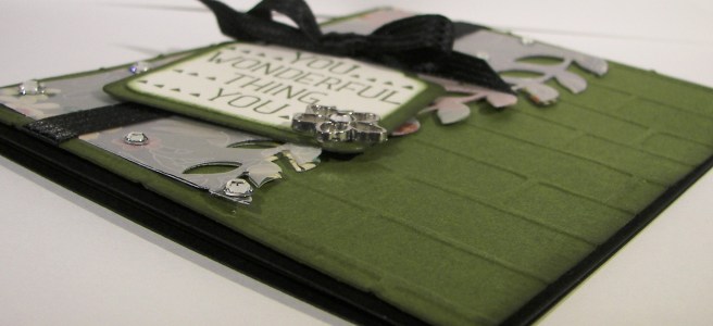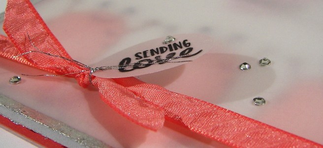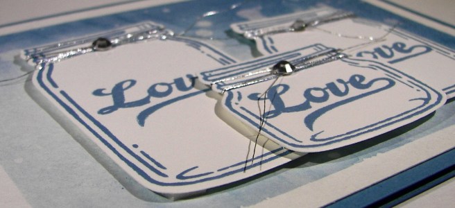 I was going to leave it with the ribbon and be happy, but I wasn’t. It needed a sentiment, but I was already committed to the velum and didn’t want to hide the opaqued monsters. What to do? I found this adorable tag die in the window box thinlits die set, grabbed a tiny sweet sentiment from the sealed with love stamp set and attached it with some silver metallic thread. Then the basic rhinestones finished it off. Phew! Several days of work on that one, that was supposed to be a quick project. Right. Either way, now I have a fun way to put all of these products to use and send out the love!