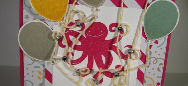 A simple shaker card is what I had in mind. I stamped these little monsters three times. I even used my stamp-a-ma-jig for oh so tidy placement. Then I did what I thought would be a quick water color moment. It turned out too quick and I thought sloppy. No problem, put a layer of velum cardstock up on some foam adhesive strips and make a fun shaker card. I was so unhappy with the painting that I just walked away. I couldn’t see through my error. Saturday night helped me through though.