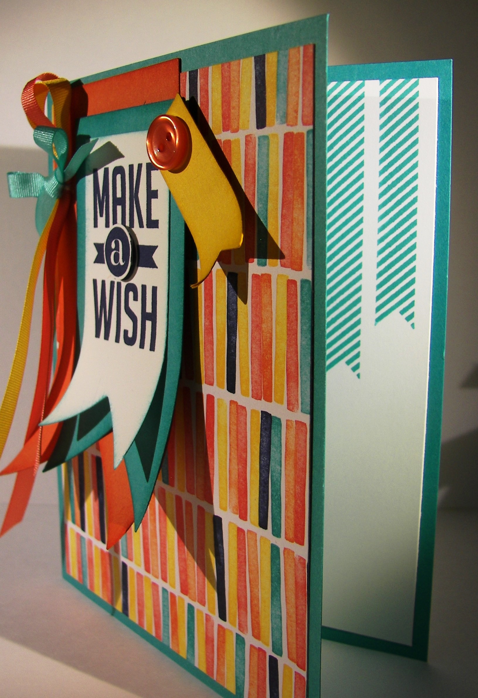 The card base and ink are bermuda bay, even the glimmer paper that is hi-lighting the candles. That glimmer paper has been super fun to work with, I will be sad to see it go away at the end of sale-a-bration this month. I will probably get one more pack with my order this month. Maybe it will be put into the new catalog this summer? One can only hope.