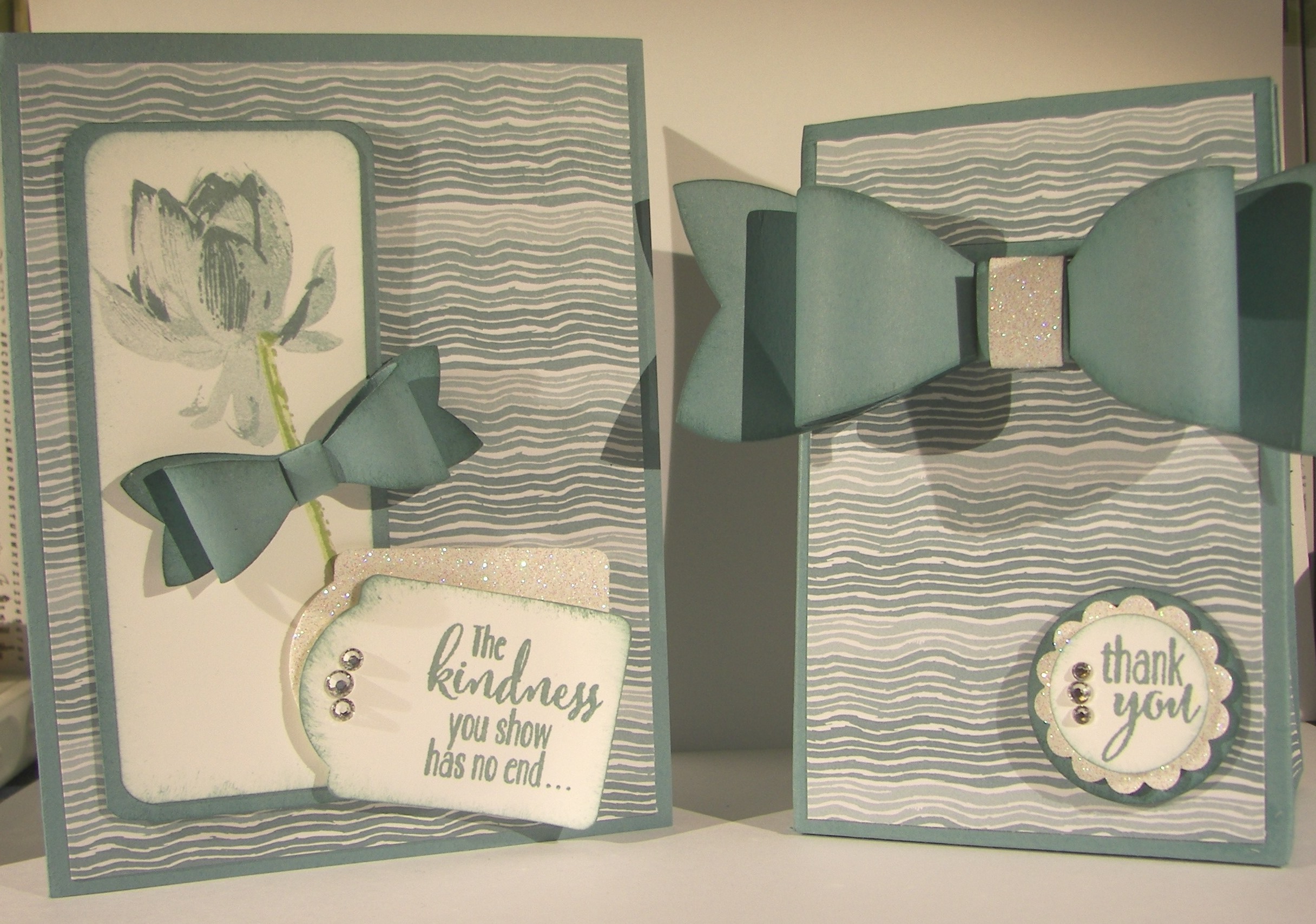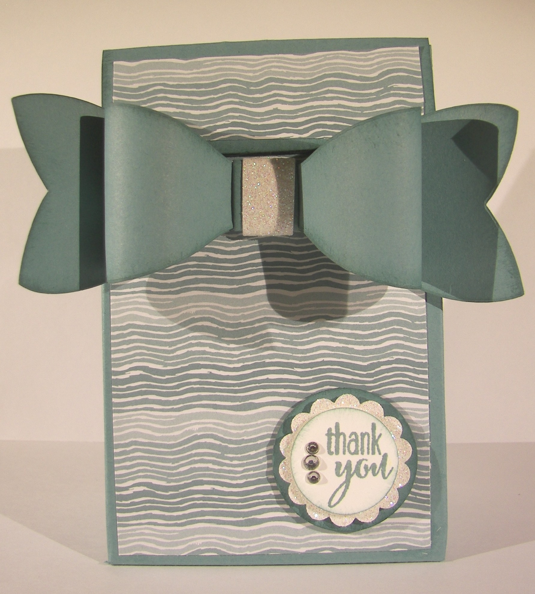 I used a full sheet of the dsp. The box ended up about 8 1/2″ tall. The band I made used two strips of paper 1 1/4″ x 10″ and I experimented a bit on the scoring to make it fit. Only took two times. I hid those on the bottom. Lots of sponging all the way around really make it look nice. I sealed up the bottom with tear n tape and left the top open to put stuff inside. As I said, it will have to be light because the paper won’t handle much. The band does give it extra structure though. Give it a try!