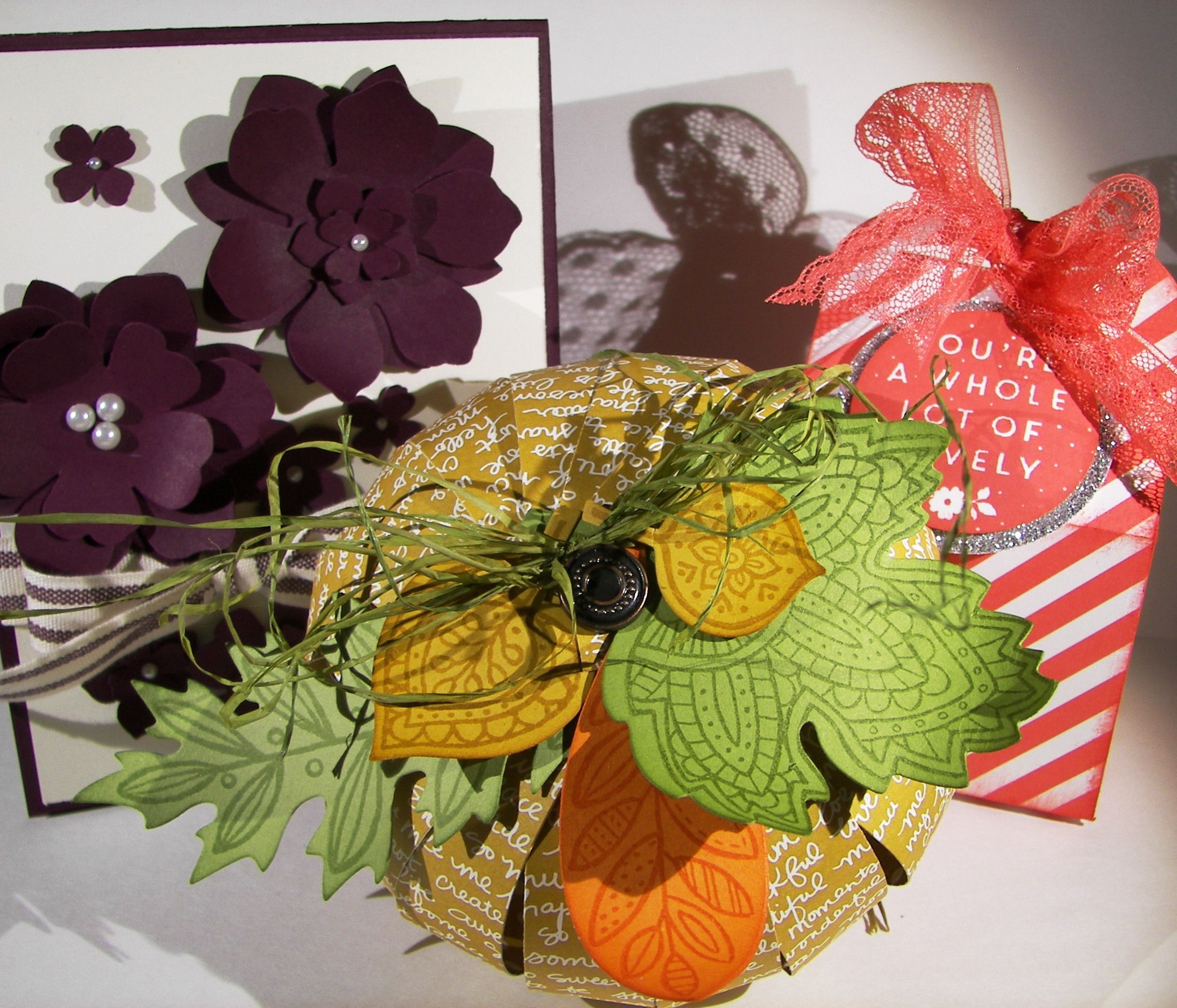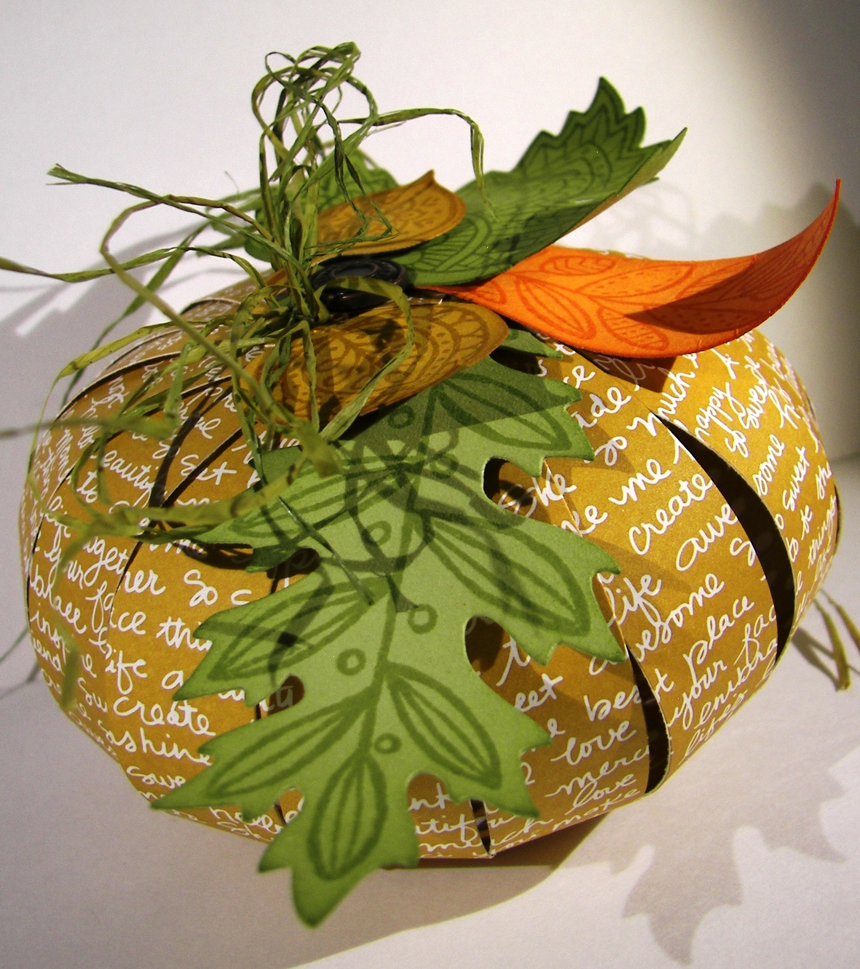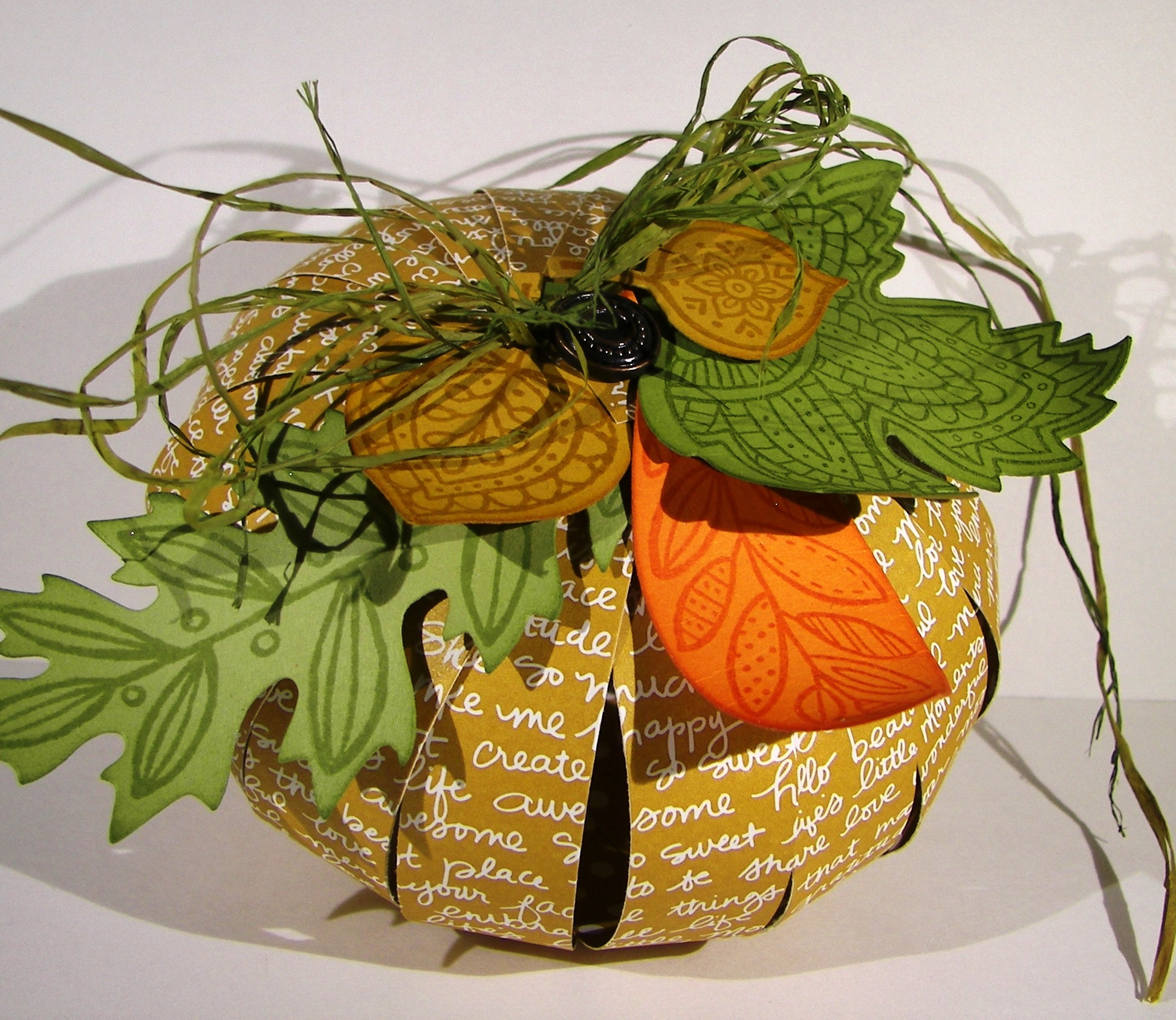 There are a few other pumpkins on my counter, but this is the one I ended up making for my workshop ladies to play with. I used a piece of dsp cut at 6 x 12 and cut strips measuring 3/4″. You get 15 strips from the sheet exactly, no waste at all. They were stacked, clipped together, and punched with the ever handy crop-o-dile at both ends. A hearty brad was used to keep the strips together, then you just fan them out. Promise, they fan out nicely and curl into this pumpkin. Then stamping and die cutting the fun leaves and place them where you like. Some of the samples had ribbon, you could top it how you like.