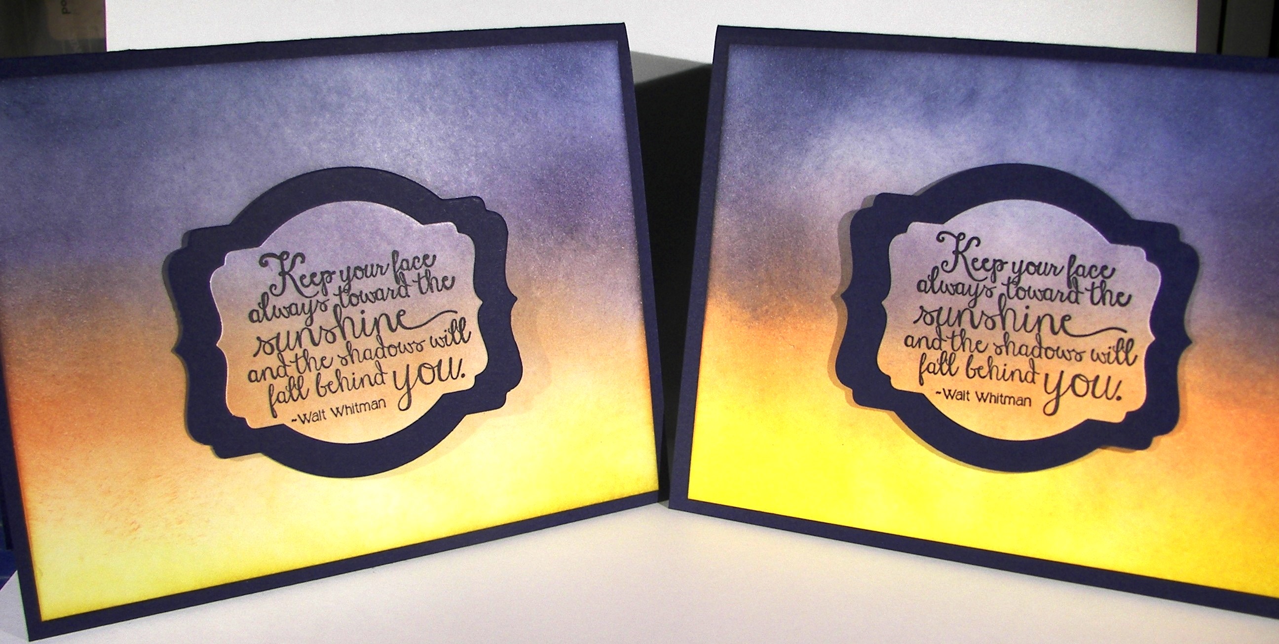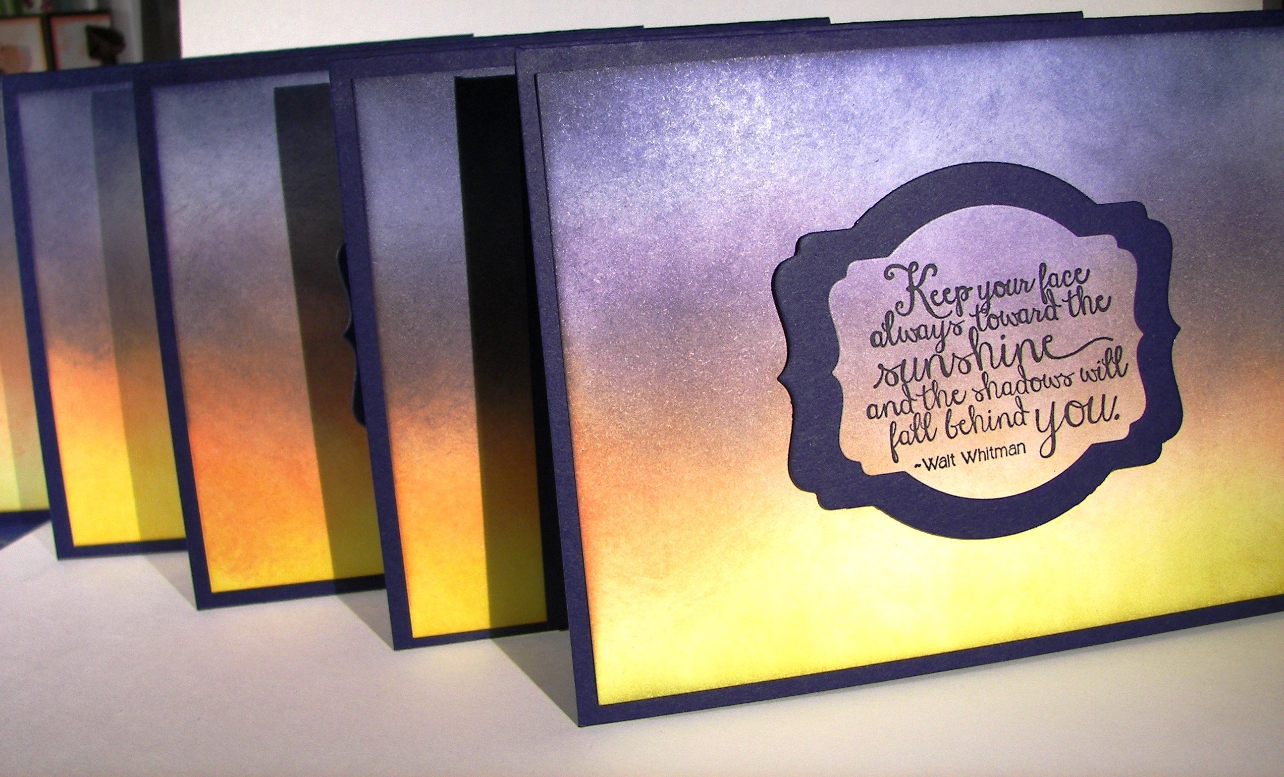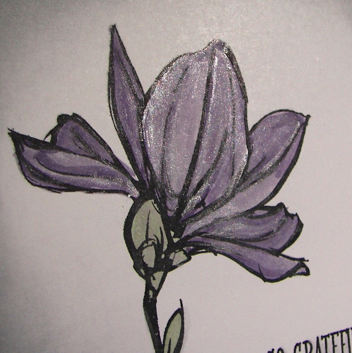 I sat down, picked out five different colors and began a water color background. That has to be one of my favorite activities, just making soft blending colors. Almost soothing. When it was dried I added the huge floral stamp from the garden in bloom set. Some images were stamped full strength and others stamped off once. I wasn’t quite happy there, so I took it up a notch. I have these awesome guilding flakes that give a really cool embossed look. You brush on glue from a pen, set them on the glue and swirl a stipple brush over that to get rid of the excess. This time I brushed the glue directly on the stamp, stamped a glue image and then put the flakes on. It worked out so great! Can’t wait to do it again.