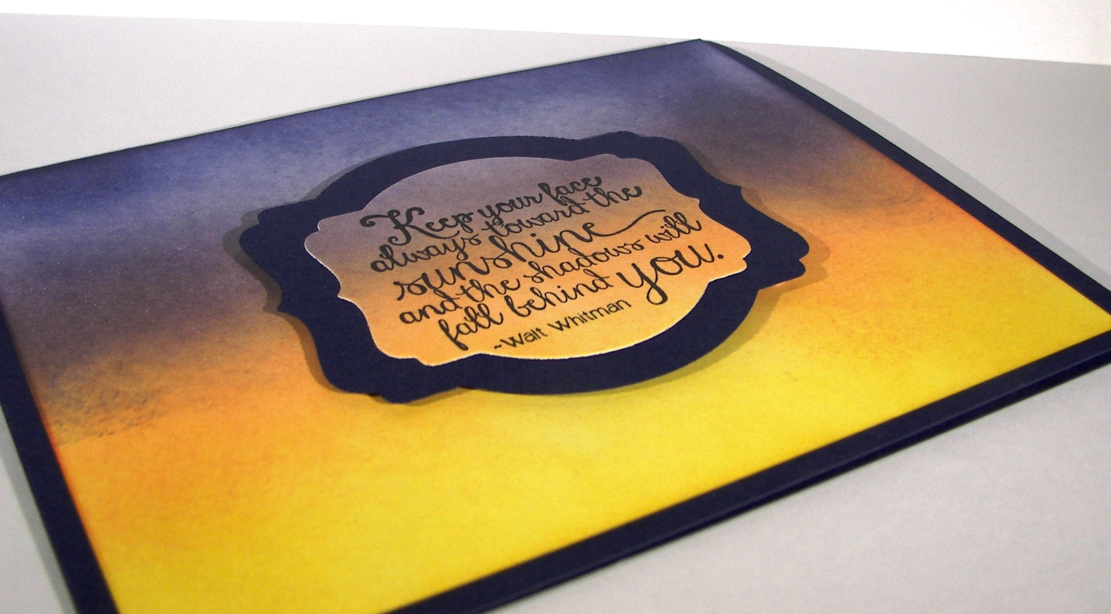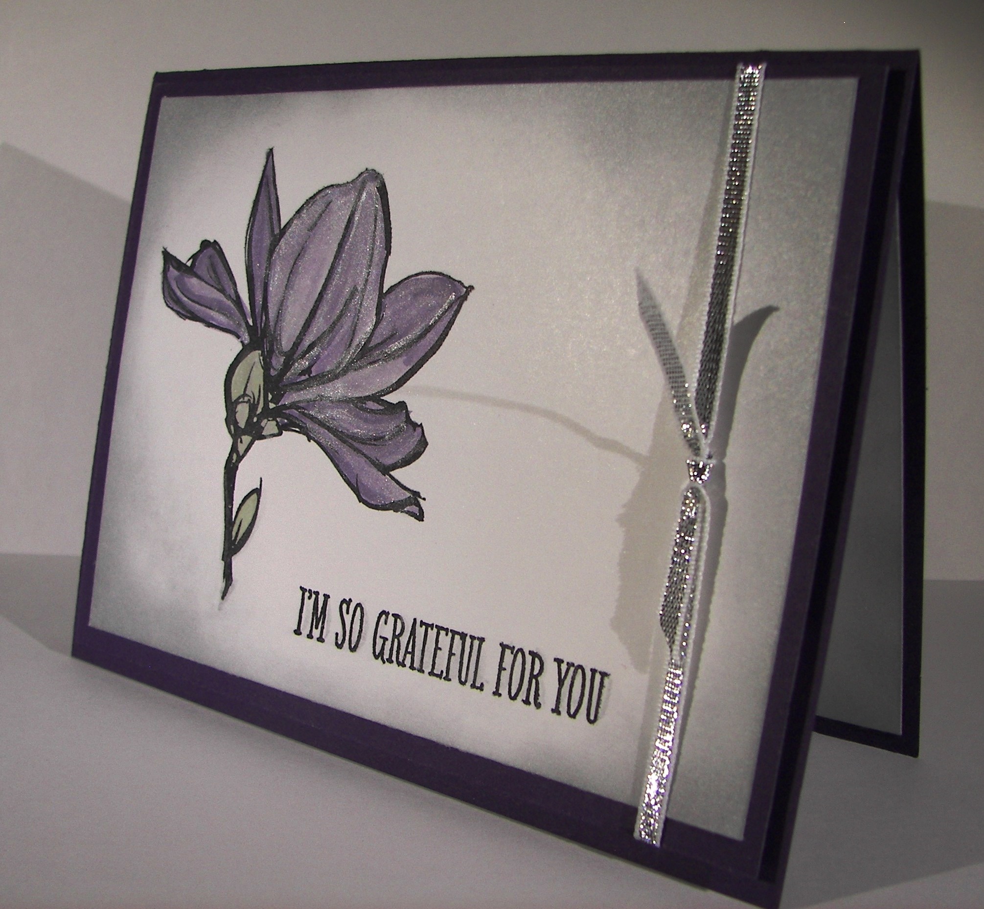 The tag was simply created with water color paper. I stamped the image, rounded the corners and sponged the edges. It was a bit stark so I took a light wash of color right over the top. It blurred the sentiment a bit, but not too much. A touch of ribbon on the side anchored with metallic thread and I was ready to go.