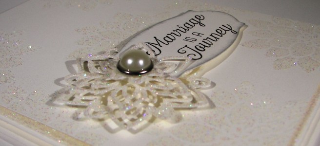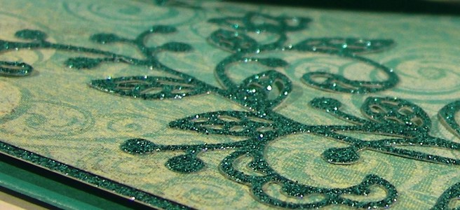 The die cut was not as easy to decide because there are so many wonderful ones to choose from. I kept it simple though and went for a favorite. The glimmer paper was cut to size and then I did the die cutting from the center, knowing it wouldn’t show, and I could make that paper last longer. Glimmer paper is such a weakness for me, especially in colors like this. The flourish was glued down with tombo and then the designer paper adhered to the glimmer paper with fast fuse. Regular adhesive and glimmer paper aren’t friends, it needs something stronger.