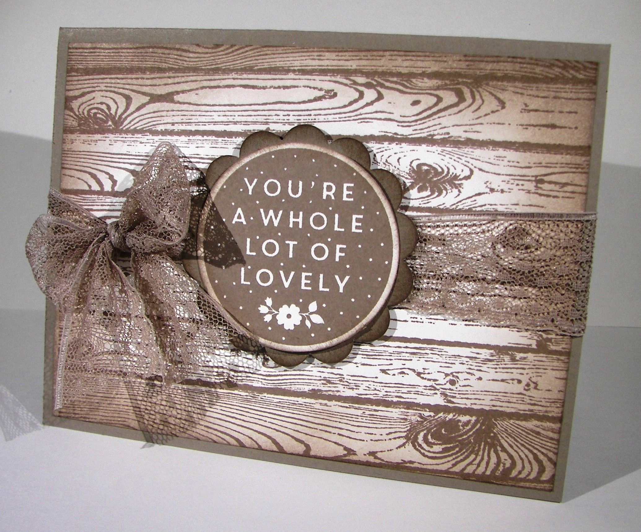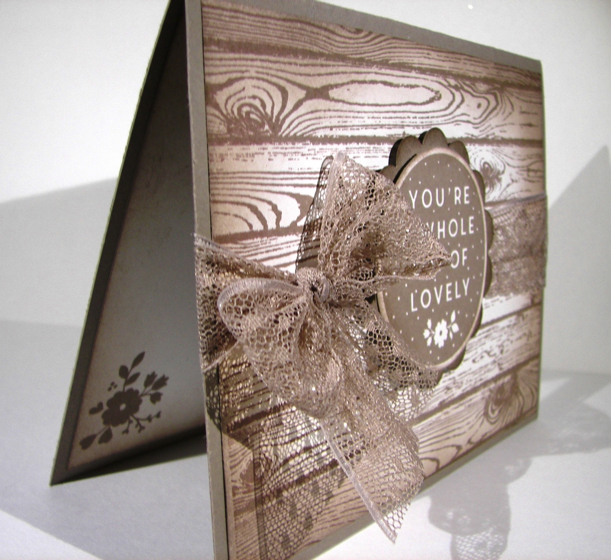Instead of a bow like the last card, I wrapped it twice around and gave it a little know. It looks great! To keep with the sponged look of the wood background I sponged the card front equally well. That also helped to draw additional focus to that awesome chicken, as if he needed help.
