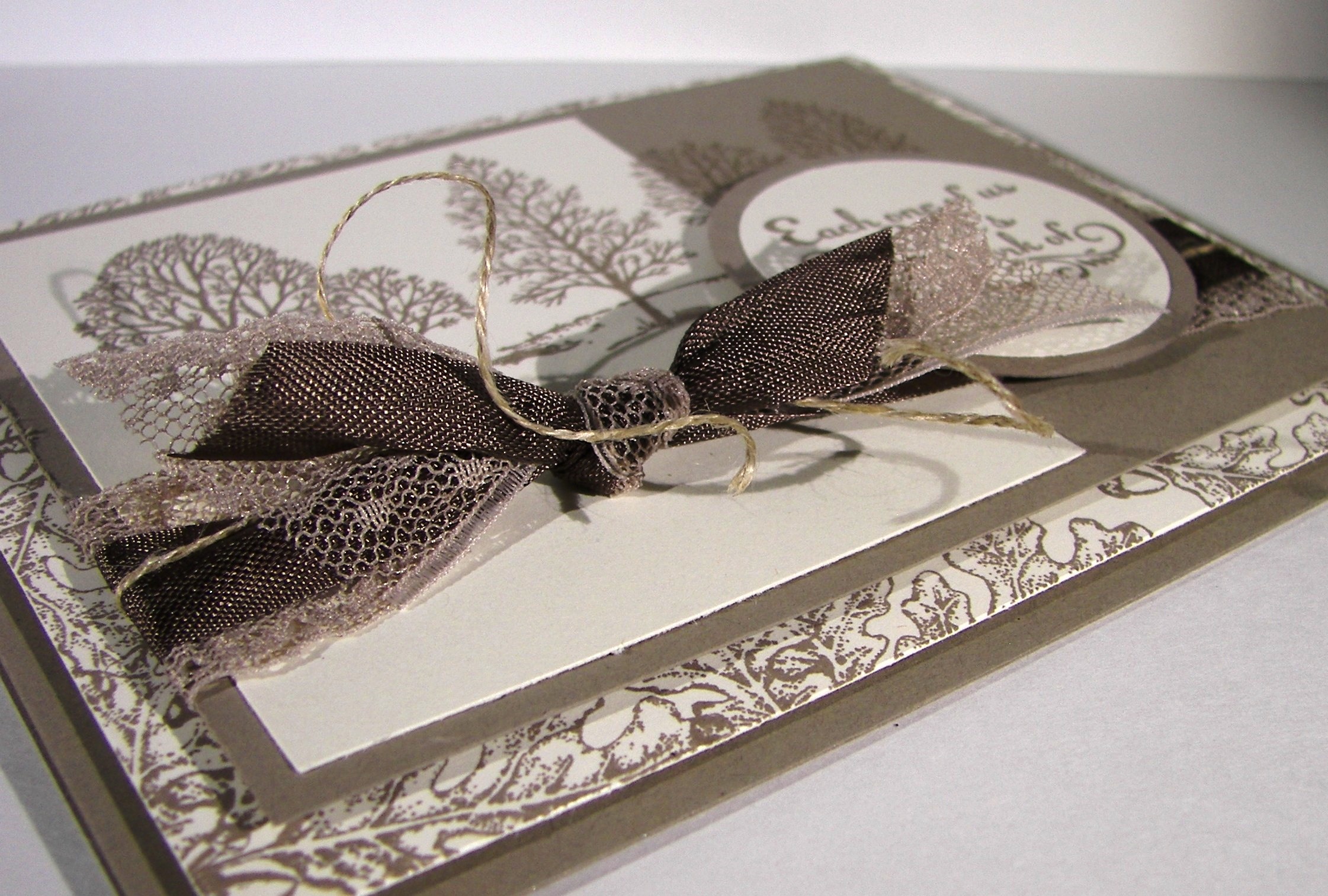 I added a touch of linen thread and used my bone folder to help it curl just a little. It also takes the kinks out, but I do love a bit of curl. I stamped a couple on scrap and punched them out with the 1 3/4″ scalloped circle punch and accented the front and the inside of the card.