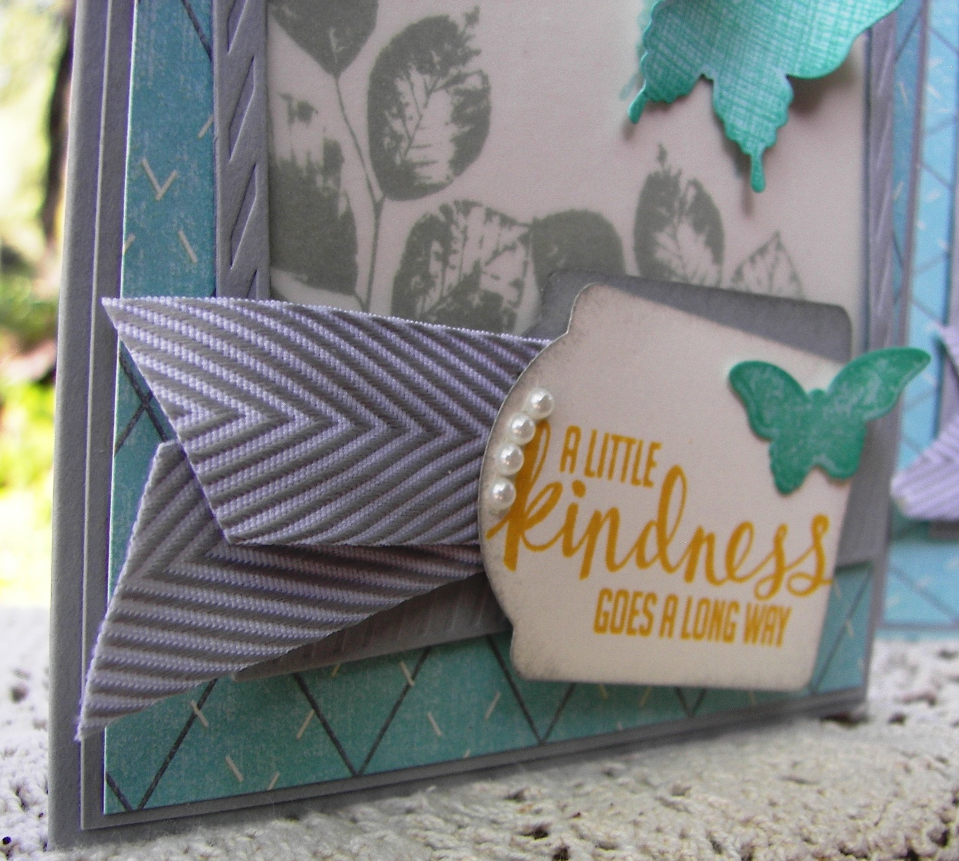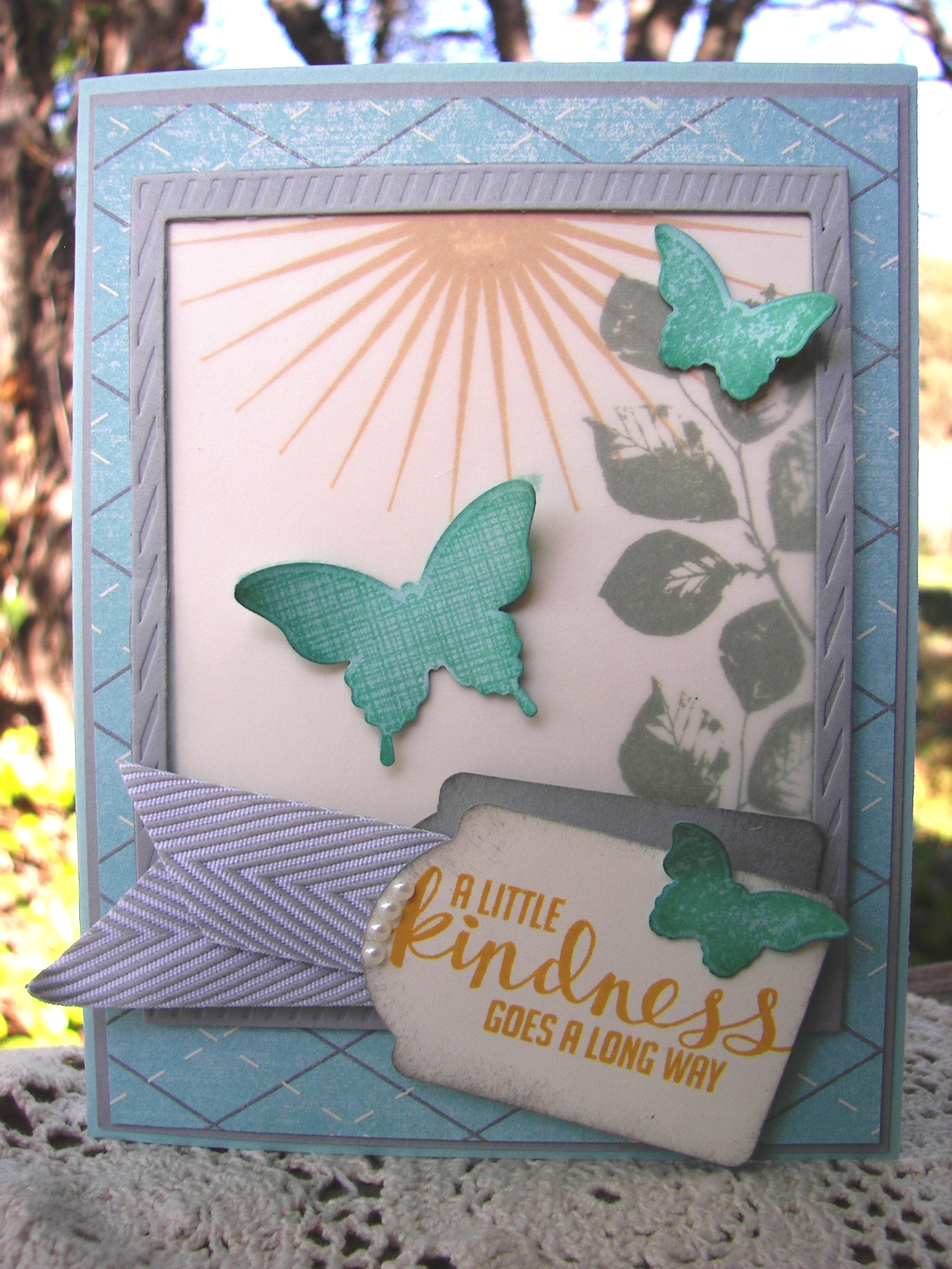 The stamp duo is from a free Sale-a-bration set called Designer Tee. It actually has ten stamps, cool! The problem came when I decided on the stamps actually. They were too small to be by themselves and the paper wouldn’t lend my go to floral options. It took longer for me to get it together. But it got there!
