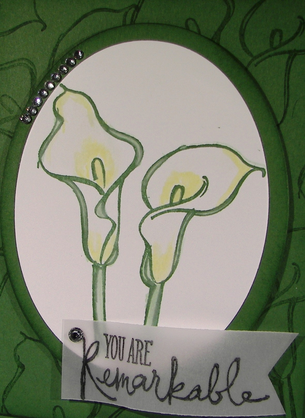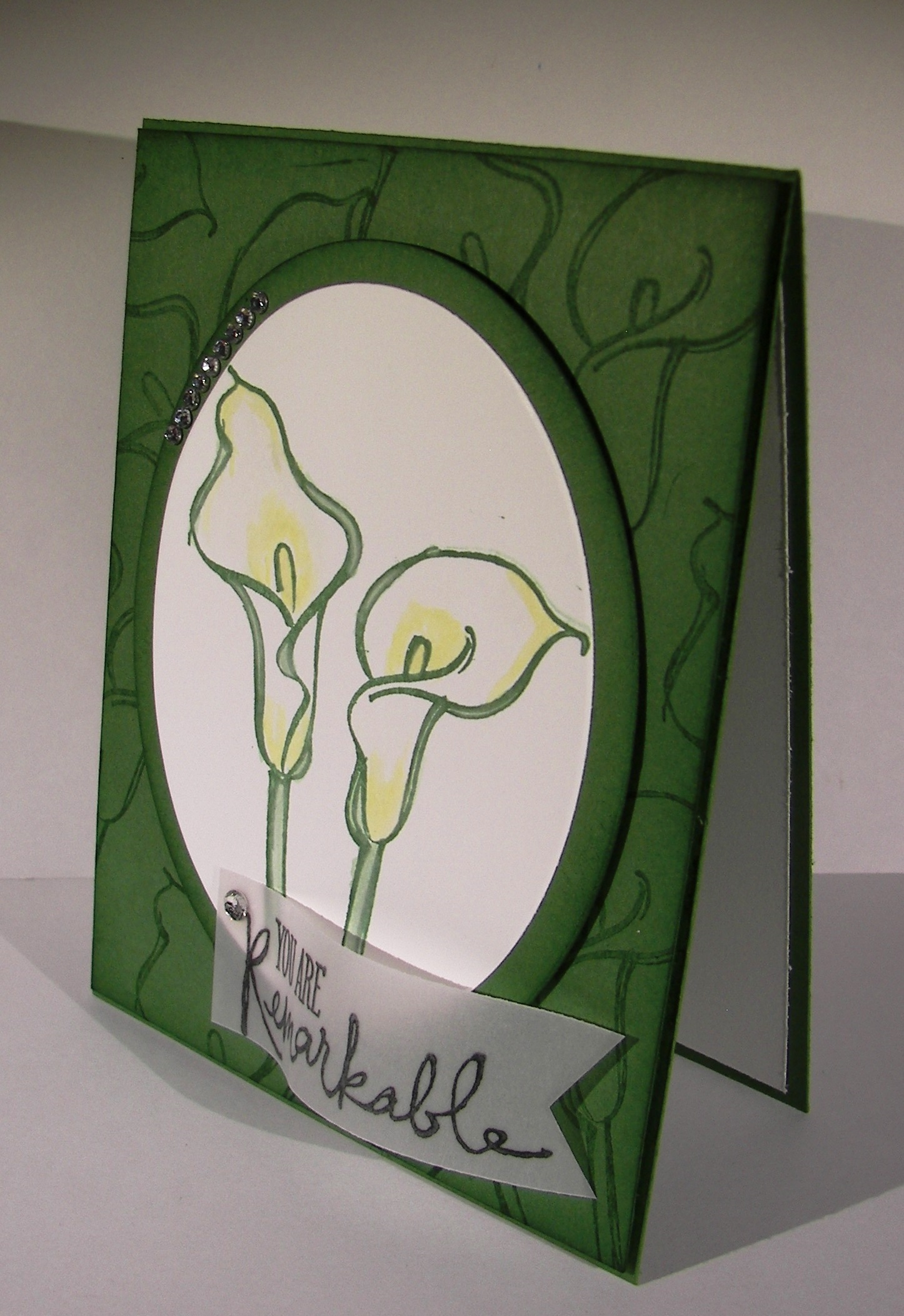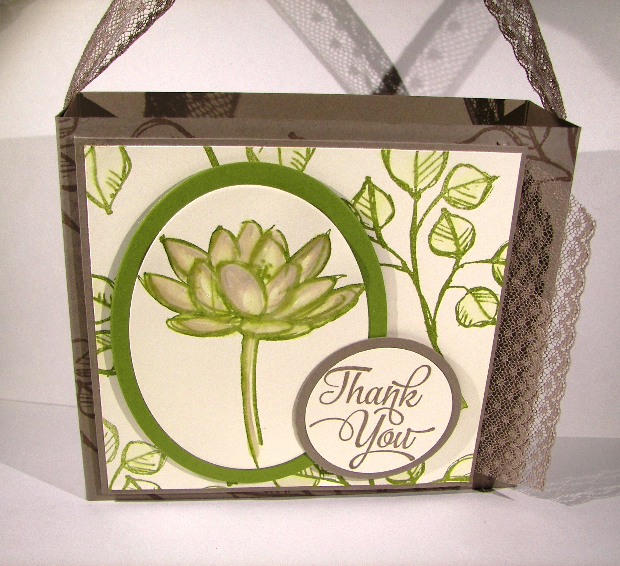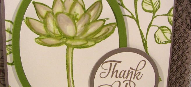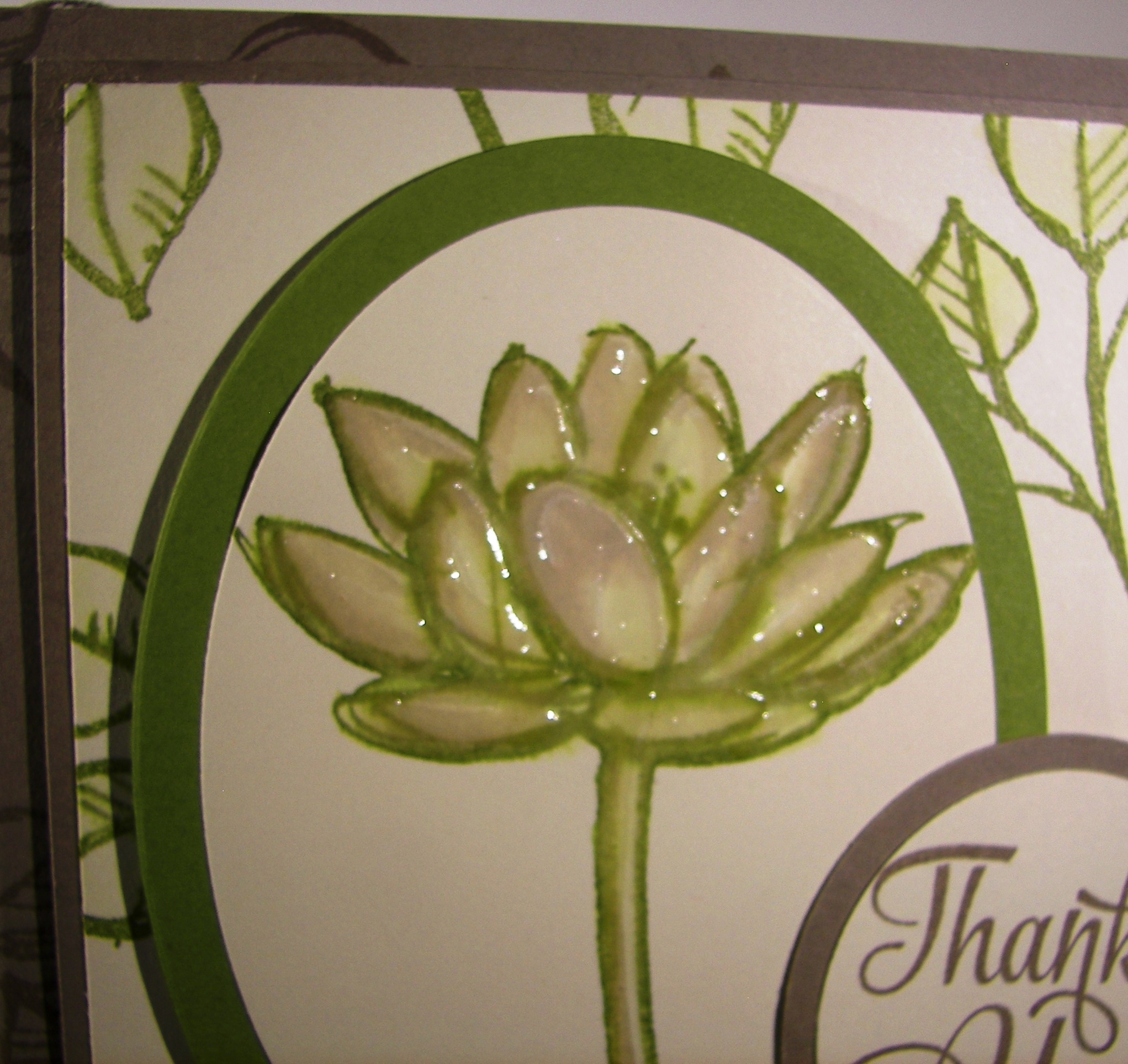 The oval framelits were put to work again for the focal point.  What a lovely flower.  I brought in tip top taupe into the flower and water colored it into the old olive.  I can tell the color difference, but I can also see a hint of lavender forming.  Interesting.  Crystal effects really made a difference in the look of the flower.  I could really use that stuff way too much.  A final stamped sentiment layered with some circle punches finished the front.