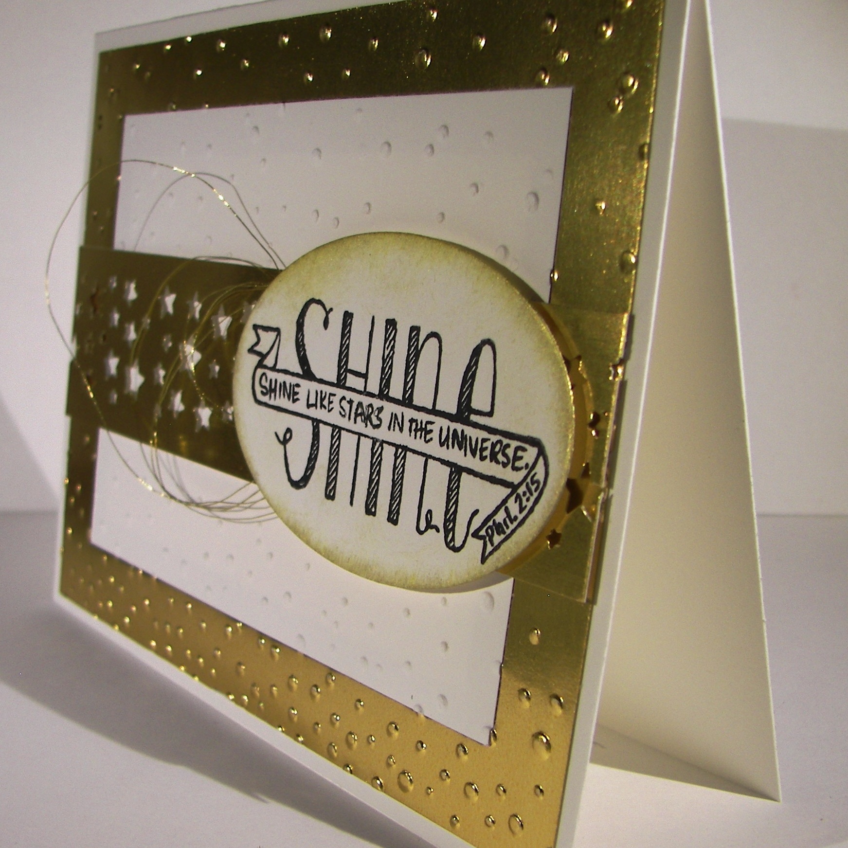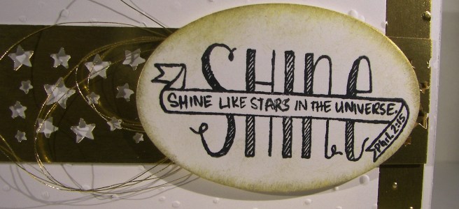 The star border punch doesn’t get to come off my shelf much, but this was the perfect job for it.  Stars stars and more stars.  The heavens are full of them and I wanted the card to do so as well.  Mission accomplished.  The card base is made from the heavy weight whisper white.  Sometimes I cannot get enough of this stuff.  I accented the sentiment with a hefty twisting of metallic gold thread. I decided it made my sentiment look kind of like a shooting star or a comet.  I love feeling creative.
