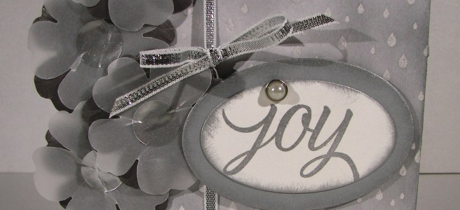 A single stamp from the Your Presents set put the focus just right.  It was framed with a smokey slate oval and both were sponged with more silver ink.  The “i” was dotted with a metal rimmed pearl and a tiny ribbon was wrapped around.  Add one more awesome card to the mix.  A very rewarding project to make and enjoy.
