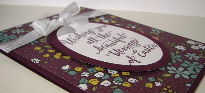 I will definitely miss this beautiful color, blackberry bliss, when it retires this summer.  I do love new colors, but this one just might stay around.  The stamp fits only just inside the oval framelits, which allowed a nice frame and a lovely bow.  No extra embellishments or layering, just a lovely sentiment and strong color.
