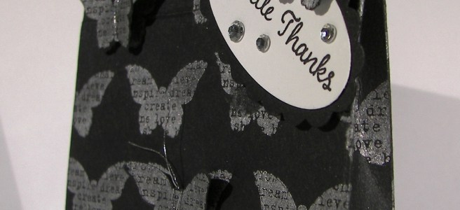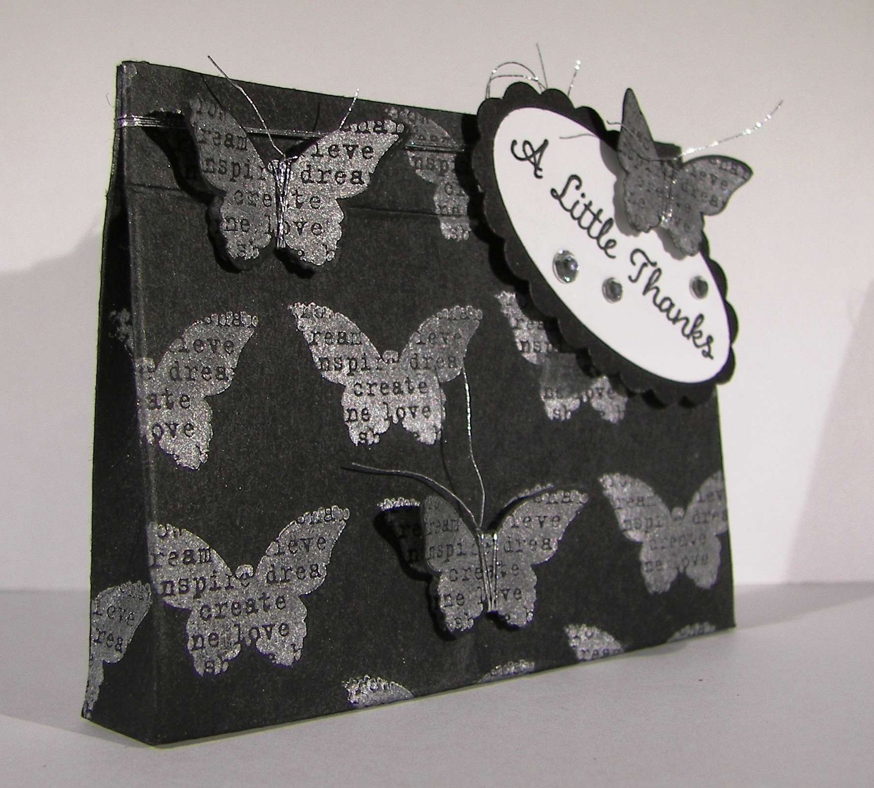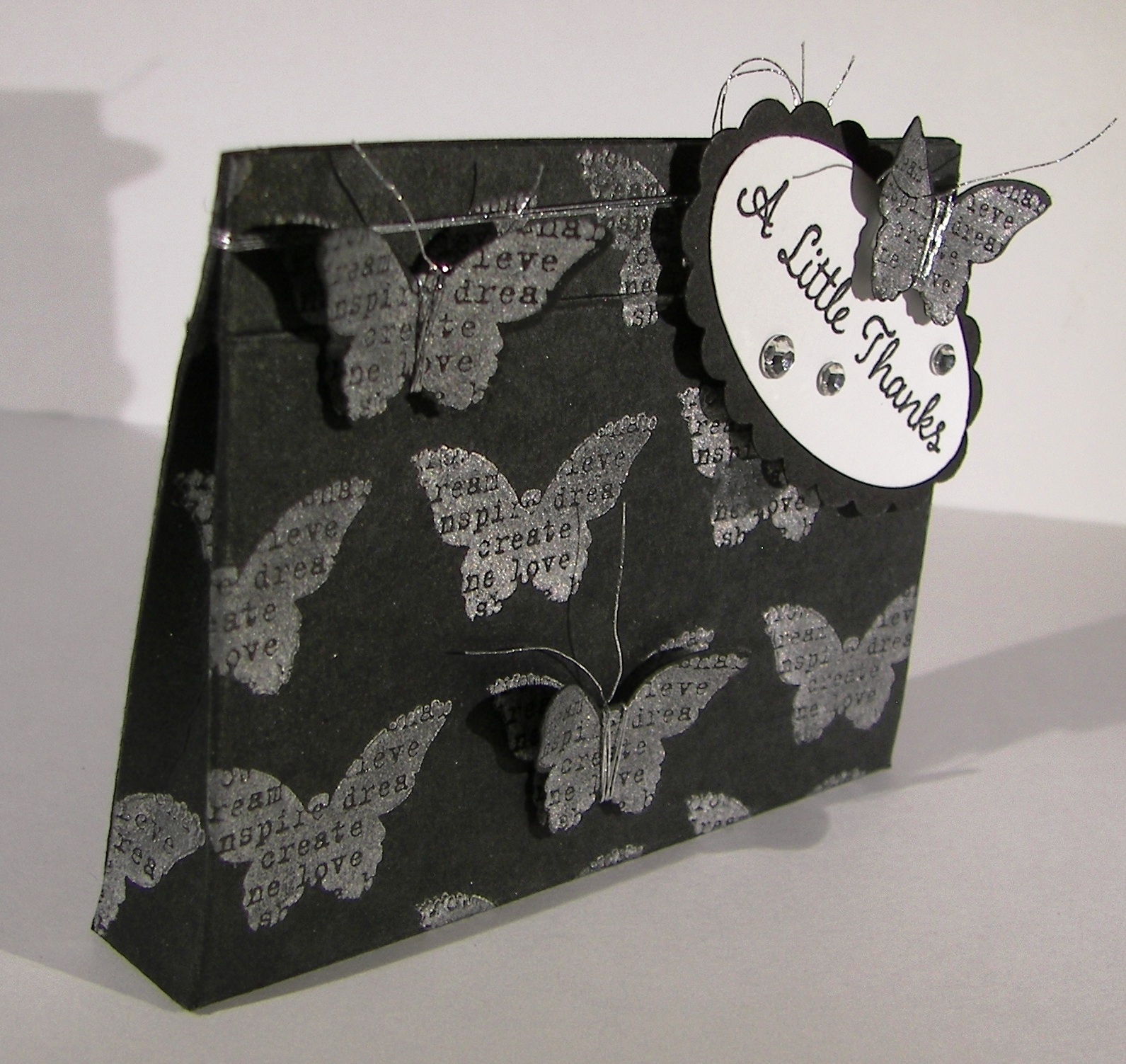 I started out with a piece of cardstock measuring 4 1/4 x 5 1/2, yup, that tiny. I stamped half way down with my little butterflies, flipped it around and went down the other way. I did that so if you turn the bag around, my butterflies aren’t upside down. Clever, right? Thought so too.