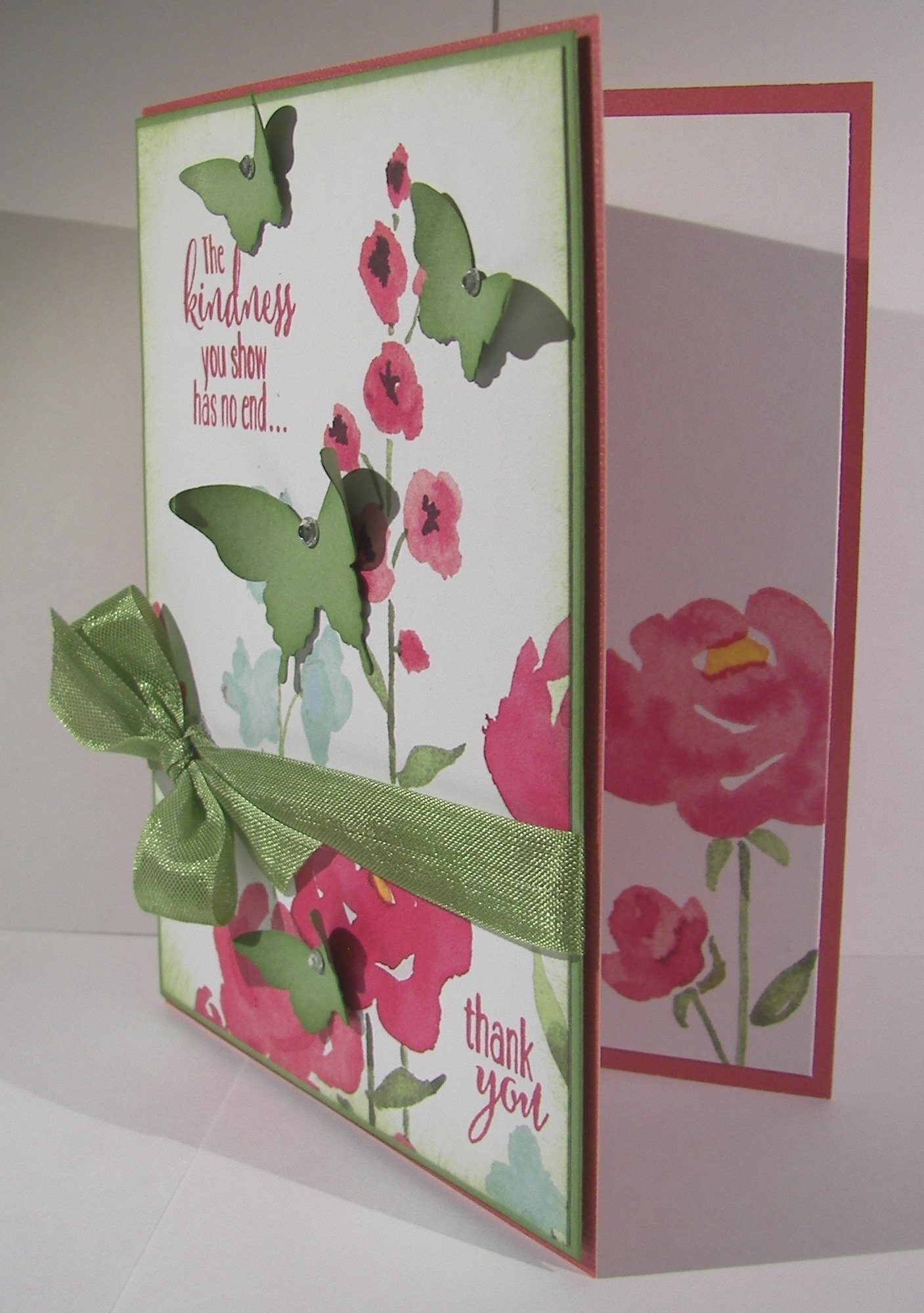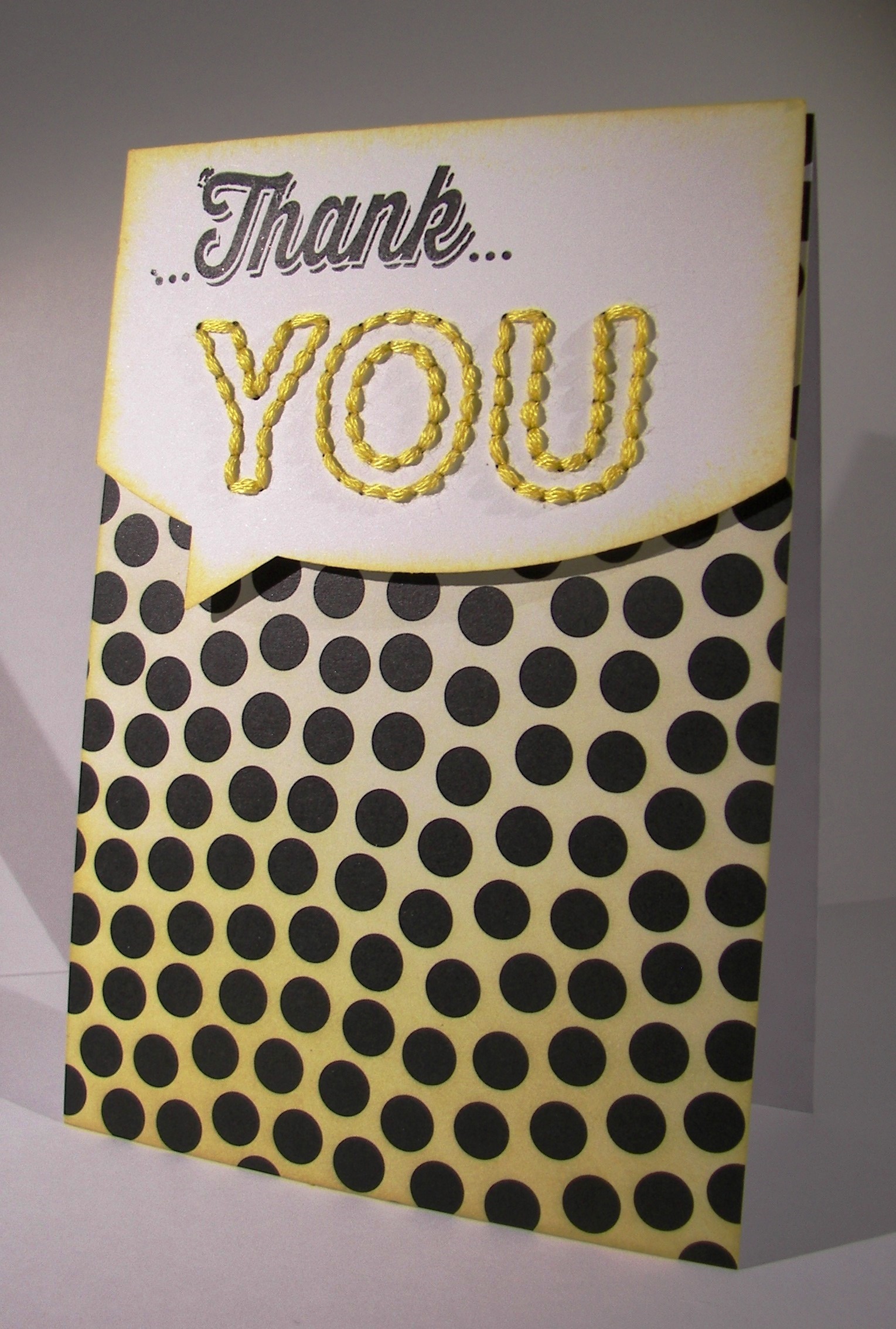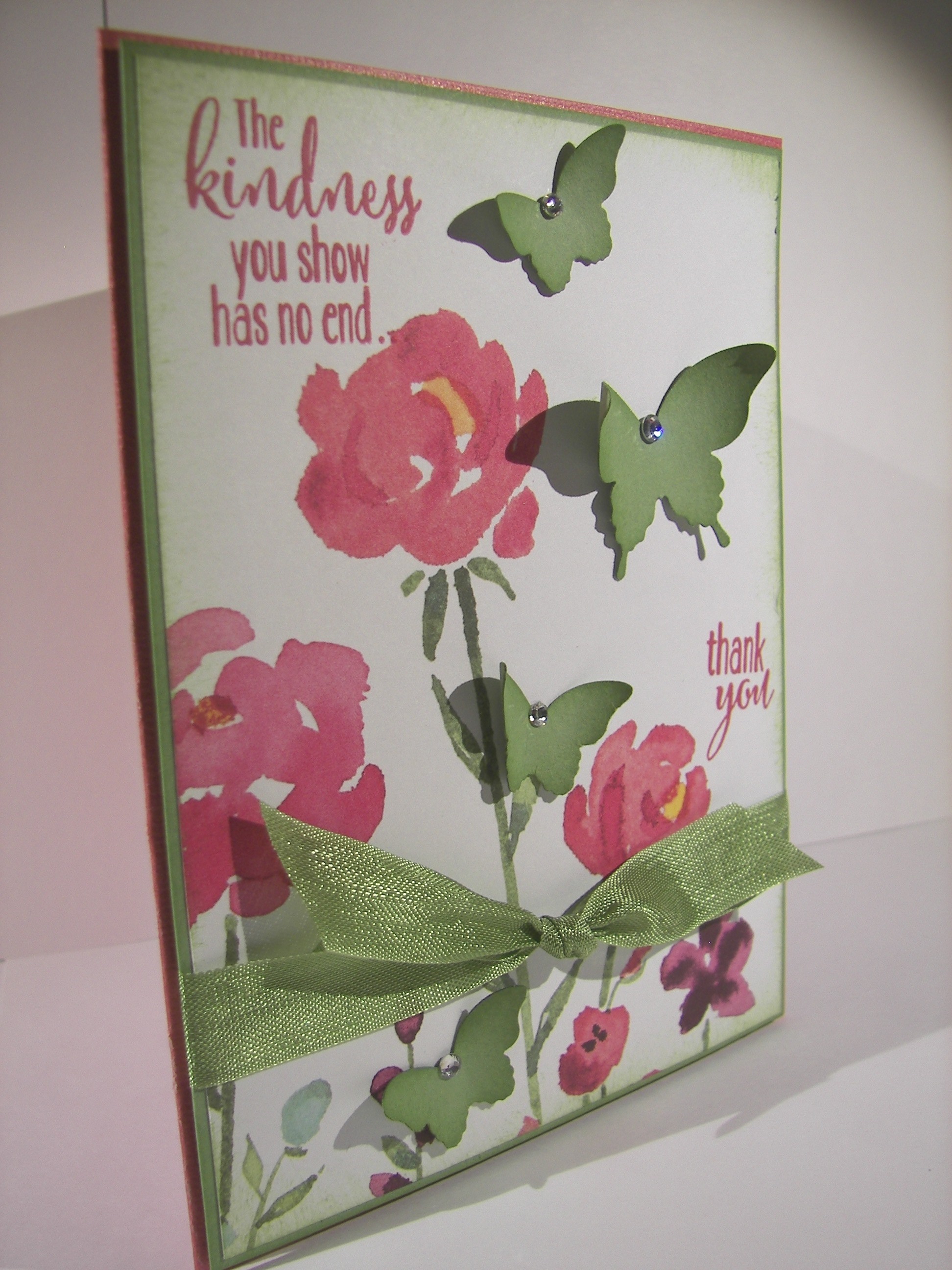 The background, and a bit on the inside, was stamped with the spotted stamp from the same set. It is random, but has a defined shape to allow filling in the entire space without looking repetitive. Very nice, very nice indeed. The front piece was wrapped in some very vanilla satin ribbon and layered up on dimensionals. The sentiment was left off completely allowing this to be an all occasion card ready to go.